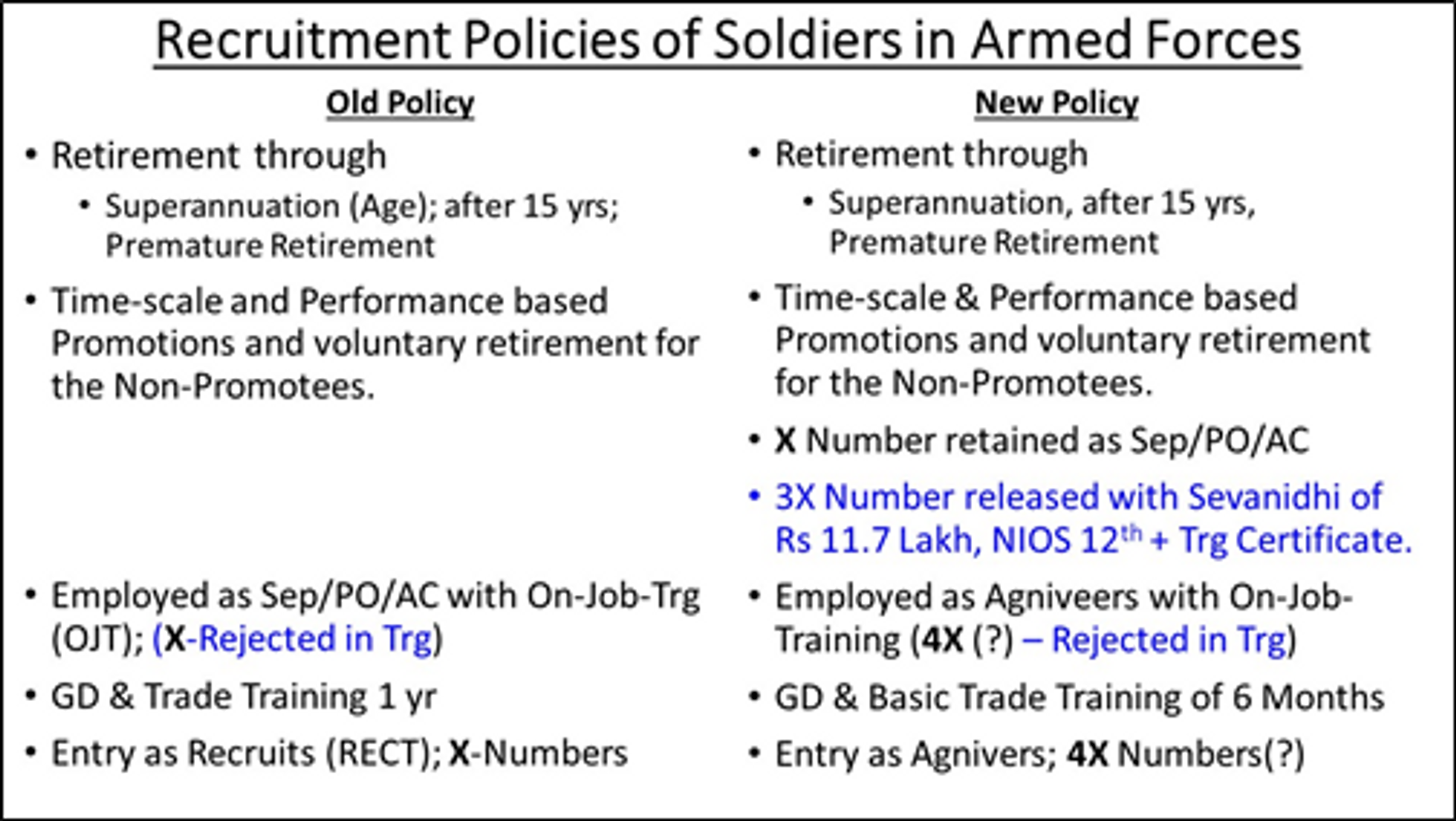 In an attempt to become permanent, there could be an effort by some to adopt unfair / illegitimate means to seek favours of their immediate bosses. Both Govt and services have to ensure that no exploitation/unfair means are adopted towards this. Further progression of their career through promotions and long services shall remain the same as in the old policy but it may also be appropriate to give weightage to the 4 yrs of Agniveer training in their permanent employment and promotions.