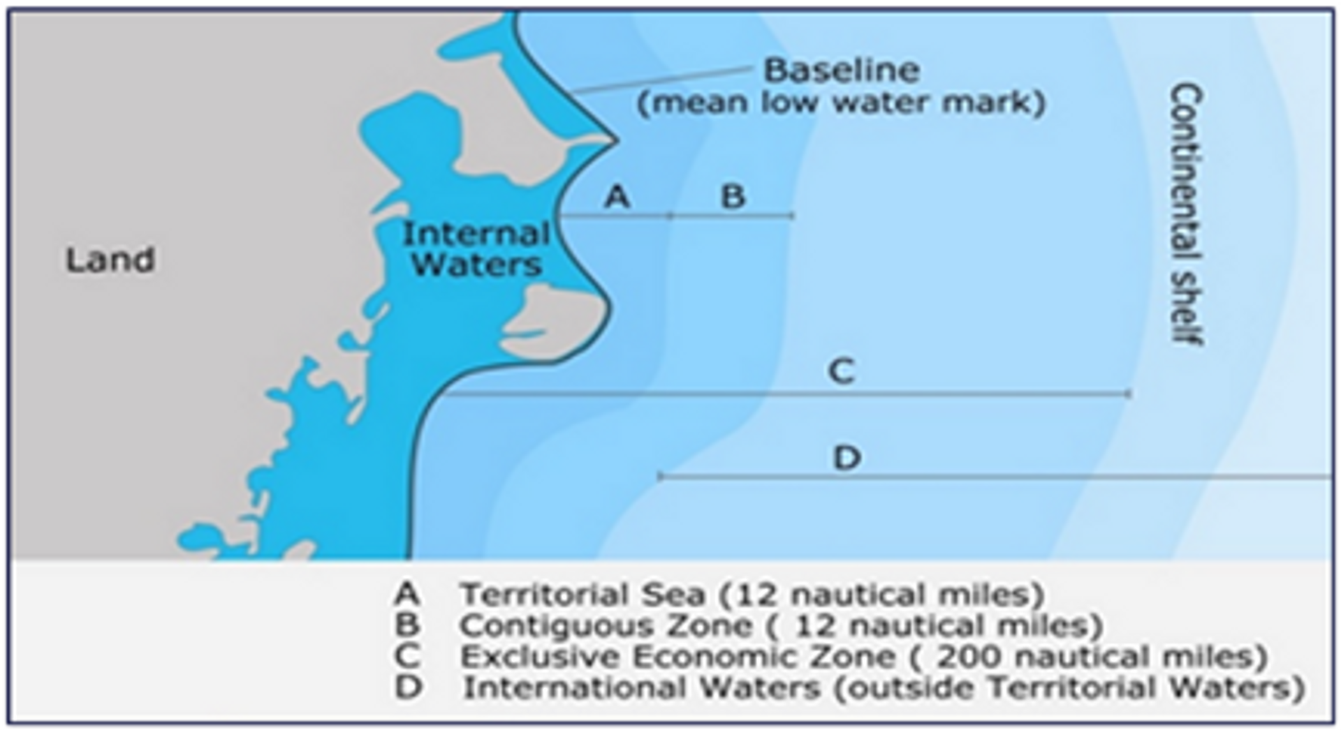 It was an arbitrary and unjustified actions of the Chinese against the UN conventions and laws of the sea (UNCLOS) that demarcated only 12 nautical miles (NM) as territorial waters and other 12 NM as contiguous zone if available. Of course, all nations may have their ‘Exclusive Economic Zones (EEZ) to exploit the marine resources if that is not shared by others too. All these demarcations are shown in the figure below as shaded areas A, B & C respectively. Beyond the EEZ, it is international water that no one can acclaim and that must remain free to the international communities for maritime activities. As far as EEZ is concerned, here too the international maritime activities are permitted provided information of it is provided for its passage.