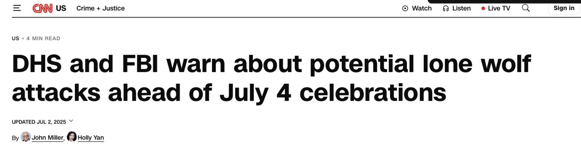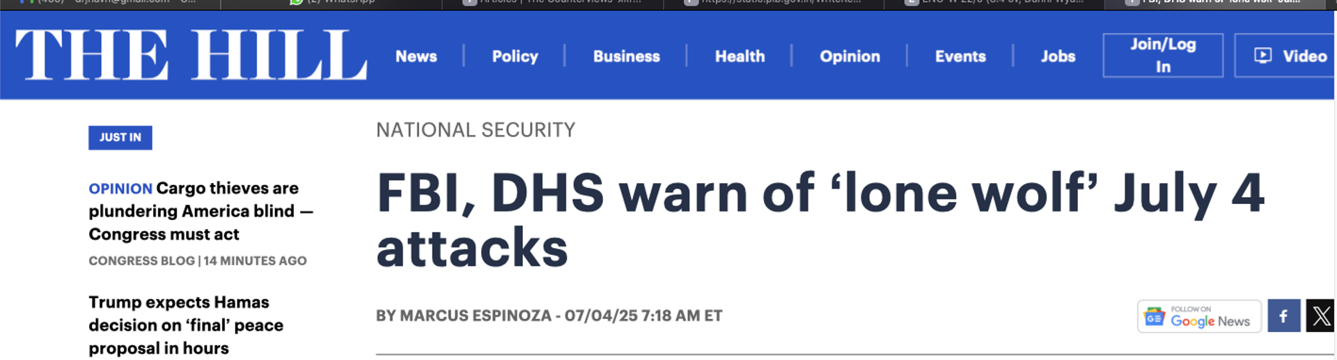 There are rumors and speculations that there could be ‘lone-wolf Jihadi attacks’ in US cities on 4th July 2025, their Independence Day. All intellegence networks are pointing to possible Islamic/Jihadi plots to attack unsuspecting citizen witnessing the celebrations. Even FBI and DHS are warning of such attacks.