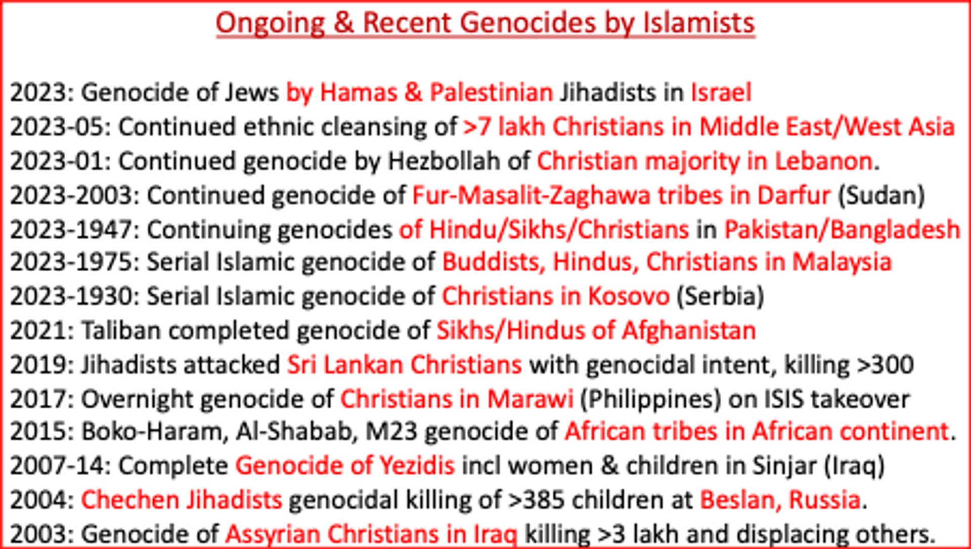 Islam was founded by Mohamed in the 7th century on hate and intolerance against the non-Islamic religions and faiths. They have a single mantra of indulgence “Convert, flee or die” that the world has been tolerating painfully for long periods. In these period, several genocides have been committed against Arabian Tribes, Jews, Christians, Parsis, Hindus, Buddhists, Sikhs, Kashmiri Pandits and Yezidis alike. In some cases like recent genocides of Sikhs/Hindus in Afghanistan/Pakistan and Pandits in Kashmir, Fur-Masalits-Zaghawa African Christian tribes in Darfur (Sudan) since 2003 (ref Human Right Watch report “Darfur Destroyed”, https://www.hrw.org/report/2004/05/06/darfur-destroyed/ethnic-cleansing-government-and-militia-forces-western-sudan), yet the UNHRC continues to remain totally mum possibly succumbing to the OIC pressure. Not a single independent fact finding team have been sent by the UNHRC to these nations. On the other hand, several investigation teams have been deputed to Palestine to investigate the excesses and atrocities committed by Israel. Leave alone special fact finding, even the annual reports of the UNHRC are highly biased towards Islamic nations yet seldom challenged/reviewed (read “ https://thecounterviews.com/articles/highly-biased-human-rights-report-2022-india-vs-pakistan/). All these confirm that UN/UNSC/UNHRC will not come to the aid & rescue of the victims undergoing Islamic genocide but they will cry loud if the Islamists like Hamas suffer retaliation that we see happening in Gaza. Today, the communities falling victims to Islamic genocides have to fend for themselves as UNHRC has chosen to turn blind eyes (read “Muted UNHRC Response Encouraging Islamic Genocides”, https://thecounterviews.com/articles/muted-unhrc-response-encouraging-islamic-genocide/). It must be mentioned here that the world has witnessed other types of genocides too (read “ International Day of Commemoration and Dignity of the Victims of Genocides”, https://thecounterviews.com/articles/un-international-day-genocide-/).