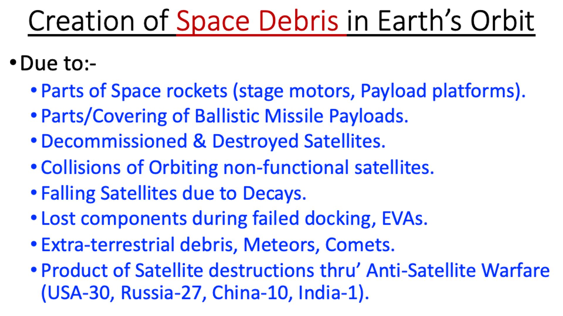 The space debris of concerns mainly consist of various parts of the propulsion systems of numerous rockets during several decades were left in space after injecting its payloads and the mounting platforms. Further, dead satellites, destroyed satellites or even larger extra-terrestrial objects shedding debris along its path also got gradually trapped in Earth’s orbit as debris. The major sources of debris are enumerated in the text box below.