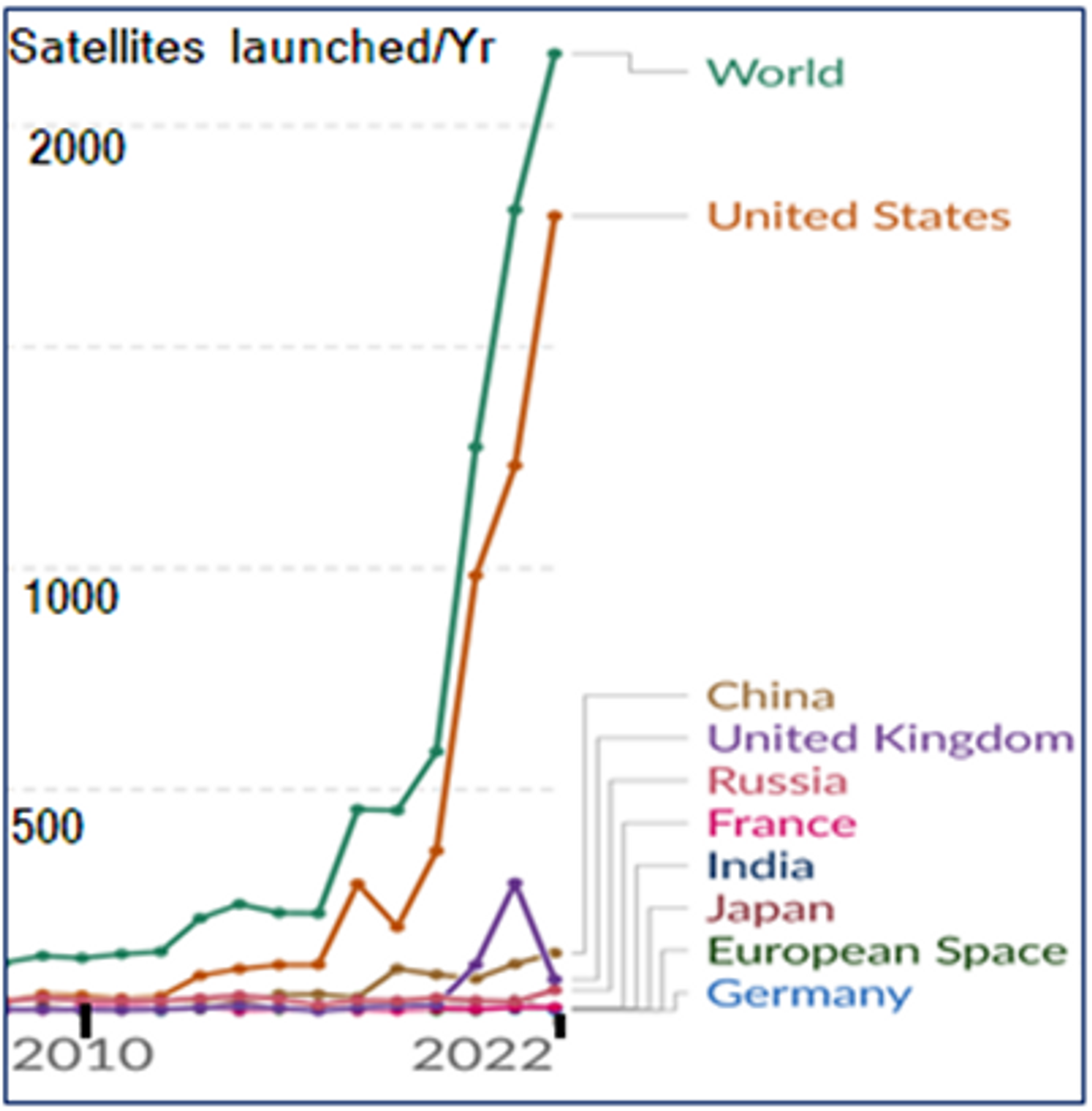 According to the Index of Objects Launched into Outer Space, maintained by the United Nations Office for Outer Space Affairs (UNOOSA), there were 11 330 individual satellites orbiting the Earth at the end of June 2023; a whopping 38% increase since January 2022 (read “How many satellites are orbiting the Earth in 2023?”, https://www.pixalytics.com/satellites-orbiting-earth-2023/). This number will continue growing rapidly in the coming years with the launch and deployments of new constellations, each having several hundreds if not thousands of satellites each, mainly in the LEO. ‘One Web’ of UK and ‘Starlink’ under SpaceX of USA are awaiting the launch of thousands of their satellites in the near future
