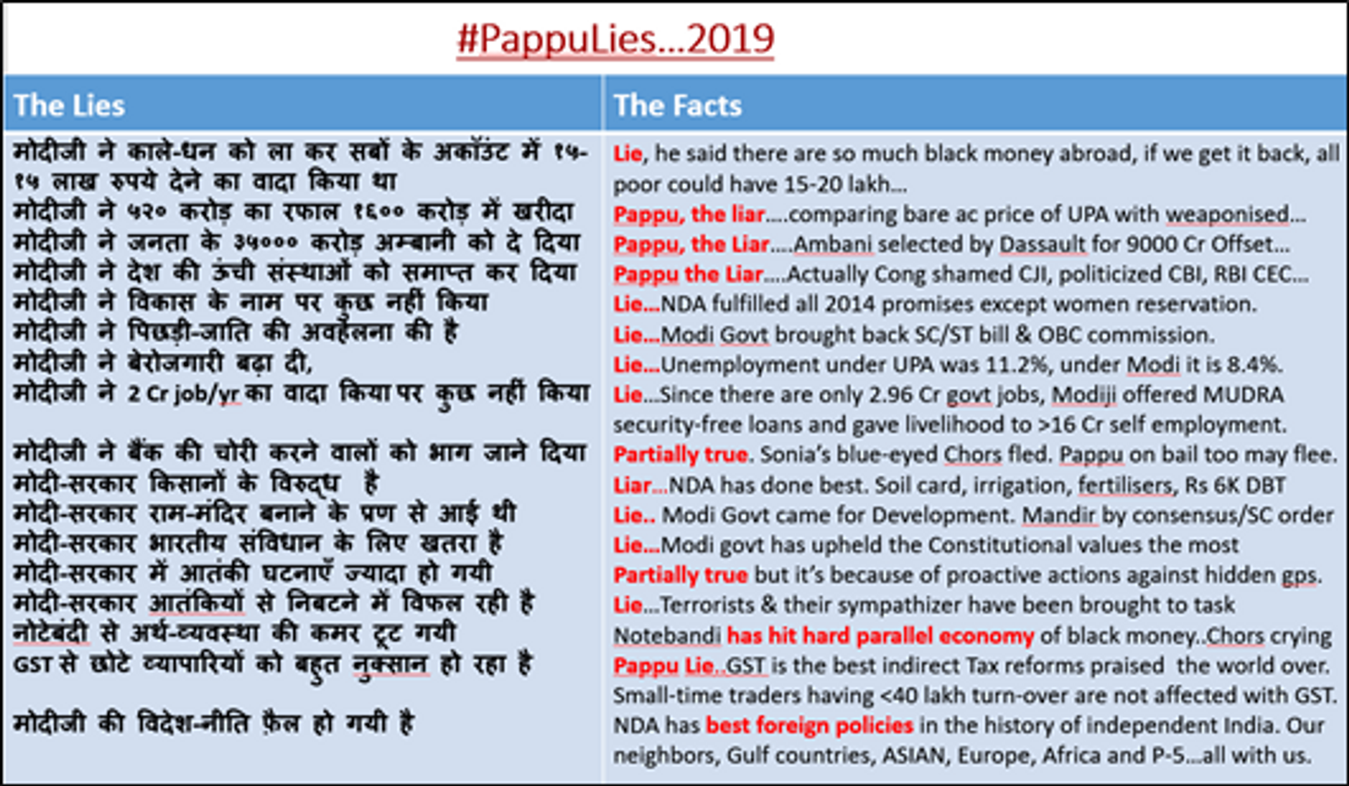 Rahul Gandhi became known as Pappu but it would be highly unjust to blame him alone. The entire congress leadership was on decline. The skeletons of corruptions and scams continued tumbling out from Congress cupboards. It was widely exploited by BJP that Congress was synonymous with corruptions. They enumerated ‘A-Z of Congress scams’. Congress party had to adapt some other tactics. Rahul Gandhi gradually became expert on fabricating lies to defame BJP. Entire congress machineries started repeating whatever Rahul Gandhi uttered who quite often, used to put his foot in own mouth. Of the lies fabricated, one gained some hold…that Modi made over payment to the French on buying Rafale to favour Ambani. He fabricated lies after lies…that Ambani was given contact for Rafale making. When proved wrong, he changed his narrative that Modi favoured Ambani to secure Rs 30,000 Cr worth of contract and that was seconded by the ex-President of France Mr Hollande, that he was not given any choice other than Reliance Company of Ambani for the offset partner. Rahul Gandhi gave a slogan…Chowkidar Chor hai…and BJP could not counter it in time by Rajasthan-MP-Chhattisgarh elections. The ruling came from the Supreme Court giving PM Modi a clean chit…but that was too late for the 3 states. BJP had lost to the lies of Rahul Gandhi that many on social media tagged it as #PappuLies (placed below). This prevented Congress from the complete annihilation in 2018 state elections.