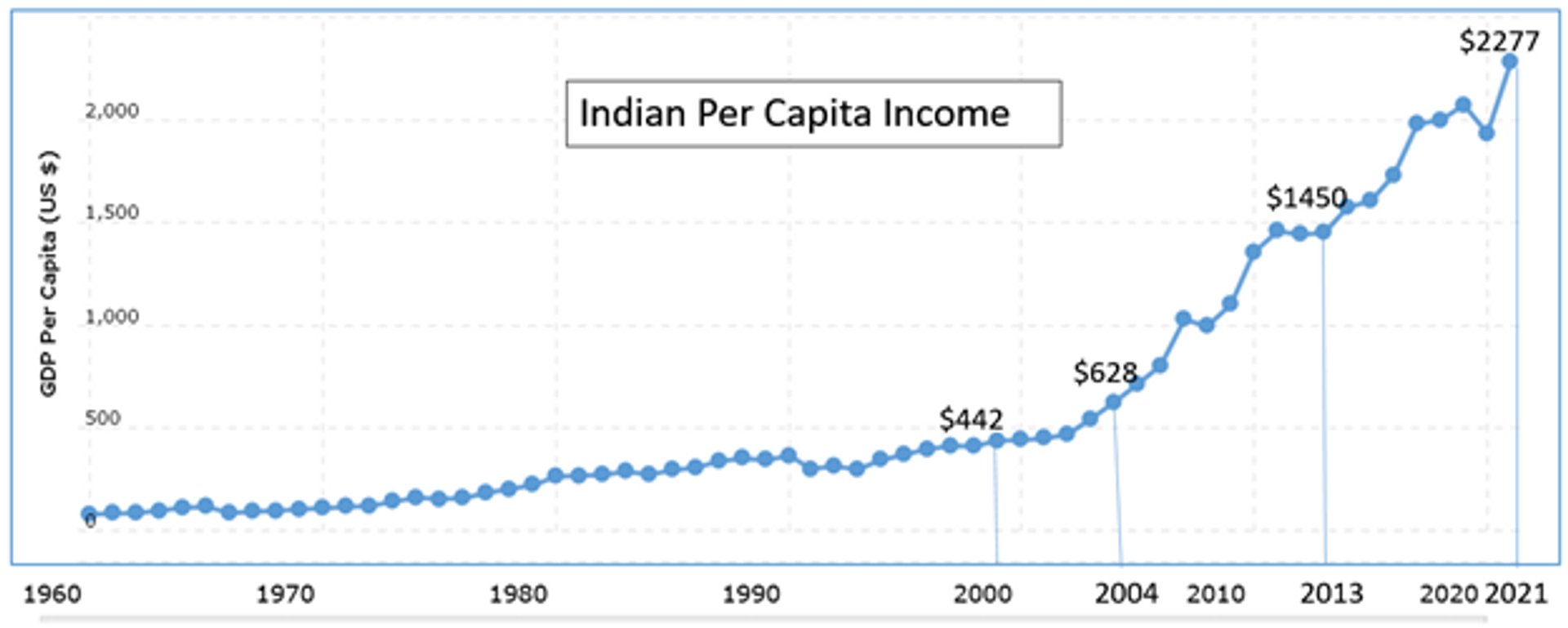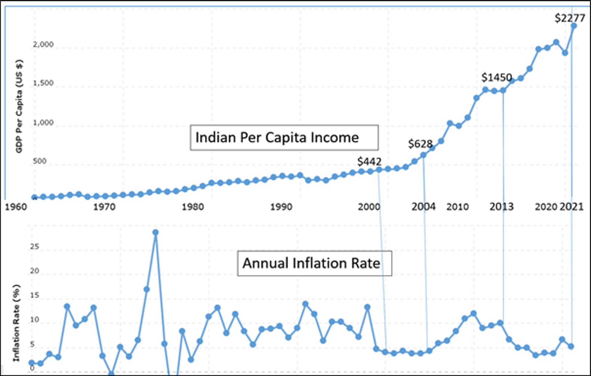 Opposition parties of Modi’s India has orchestrated a loud Chorus in the last few years, of high “Unemployment & Inflation…”. It may be ridiculous for the current congregation and components of the erstwhile UPA chanting these mantras at almost all platforms. It may be their political compulsions to show Modi govt in poor light. In their time (2009-14) the unemployment was at the embarrassing high level and the inflation in double digits with a paltry ‘Per Capita Income’; and worst…numerous scams raining cats and dogs to strain the national economy. Having said that, per capita income that gained pace in Bajpeyee Govt in 2003, kept its pace in UPA Govt too except that it had somewhat flattened on 2011-13. In Modi Govt since 2014, the growth continues except for the brief Covid19 dip in 2020.