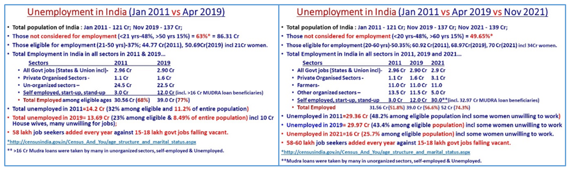 It must be acknowledged that Indian population explosion is having vicious adverse impacts on almost all fronts, impacting employment the most. On an average, 58-62 lakh job seekers are added every year. In the 8 yrs of Modi govt, about 5 Cr job seekers have risen with no rise in the Govt jobs; whether by the State or Union Govts. Surely, MUDRA beneficiaries have grown to near 34 Cr by 2021 with several thousands of Start-Up and more than 100 Unicorn companies coming up and in turn, providing jobs to millions. However, yearly requirement of new job providers are several millions and those are lacking.
