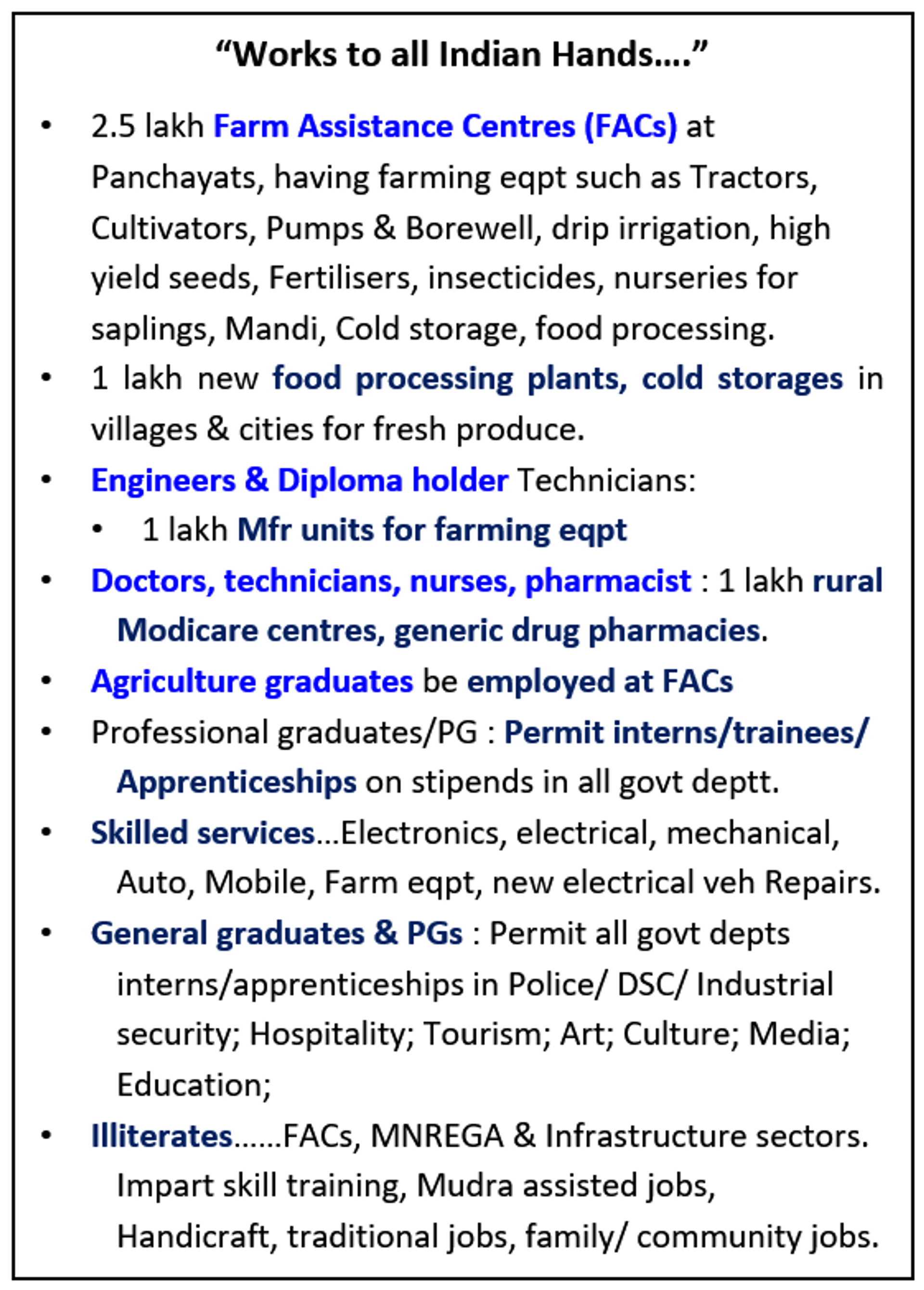 Innovative skills are producing endless list of goods. The electrical vehicles are coming on to the roads but where are its charging points? That is needed at each home, every 5-10 kms on all road, highways. The numbers are staggering. Where is the manufacturing of such chargers? The repairs, service & maintenance support for the motor vehicles in forms of garages, service centres are very less whether in villages, cities or highways. These are only few of the examples. There could be numerous such ventures that can provide works to all Indian hands. The govt of the day has to help the citizen do it by themselves, through self-employment, but is apparently unwilling to make this job-sector attractive enough as mentioned earlier.