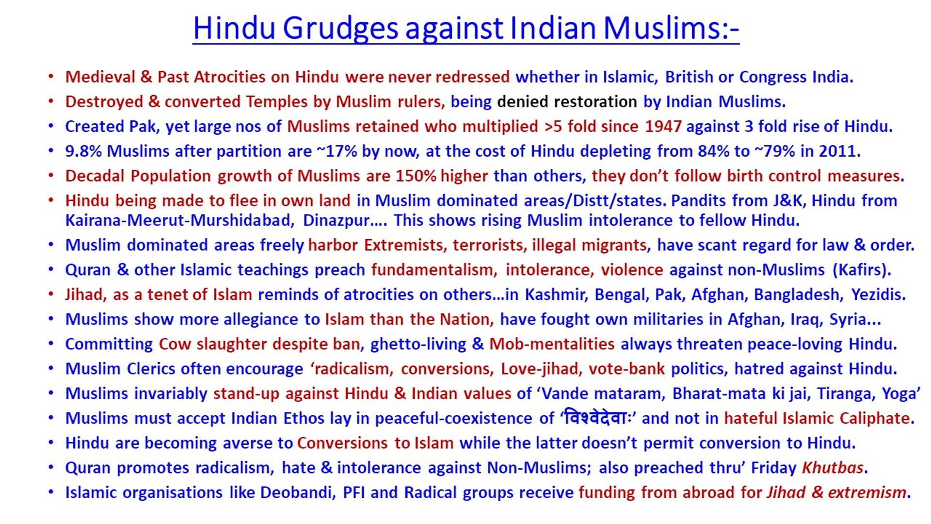 One legitimate question arises whether todays’ Muslims are responsible for the above grudges. The answer is NOT. Surely present Muslims of India are not responsible for the atrocities committed by the cruel medieval rulers BUT…many of the Muslims of today bear allegiance to those rulers and that hurts the Hindu sentiments. Most of the reasons enumerated above involve the Muslim bodies of todays’ India and unfortunately most if not all political outfits practising ‘Muslim Vote-Bank politics’ esp Congress (incl TMC & NCP) and M-Y exploiting Yadavs (Mulayam-Akhilesh duo of SP and Lalu-Tejaswi duo of RJD) indulge in it…and that is infuriating the Hindu psyche of today.
