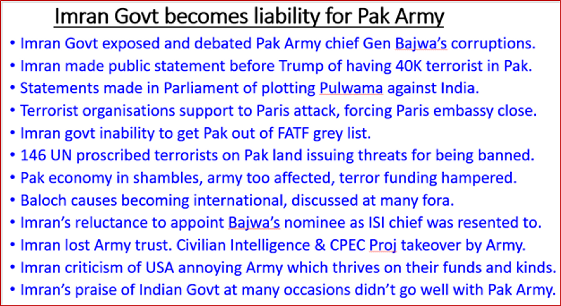 Imran also angered Pak Army that had brought him to the powers. He raised corruption charges against Army Chief Bajwa. Following FATF clamps to his neck, freedom and funding to the Jihadists started somewhat dwindling down that angered both Army and their 4th wing of Armed Forces, the Jihadists…some 40,000 terrorists belonging to 34 such organisations breeding on Pak soils. In the absence of govt or self-employment, more and more youth are compelled to join Jihadi groups. Food has become so costly that it is getting beyond the reach of the poor. Actually, there were several issues that angered Pak Army as well as the civil society which doesn’t want to support Imran’s govt. This hinted at their sure exit sooner than later. Imran Khan tried all possible manipulations for deflecting No Confidence Motion through hook or crook. His Deputy Speaker of the National Assembly pushed Pakistan into an unprecedented Constitutional crisis by rejecting the motion in toto. Even the Speaker did everything possible to deny the 'Trust Vote' when he was made to resign by a firm Supreme Court. Finally, Imran had to go.