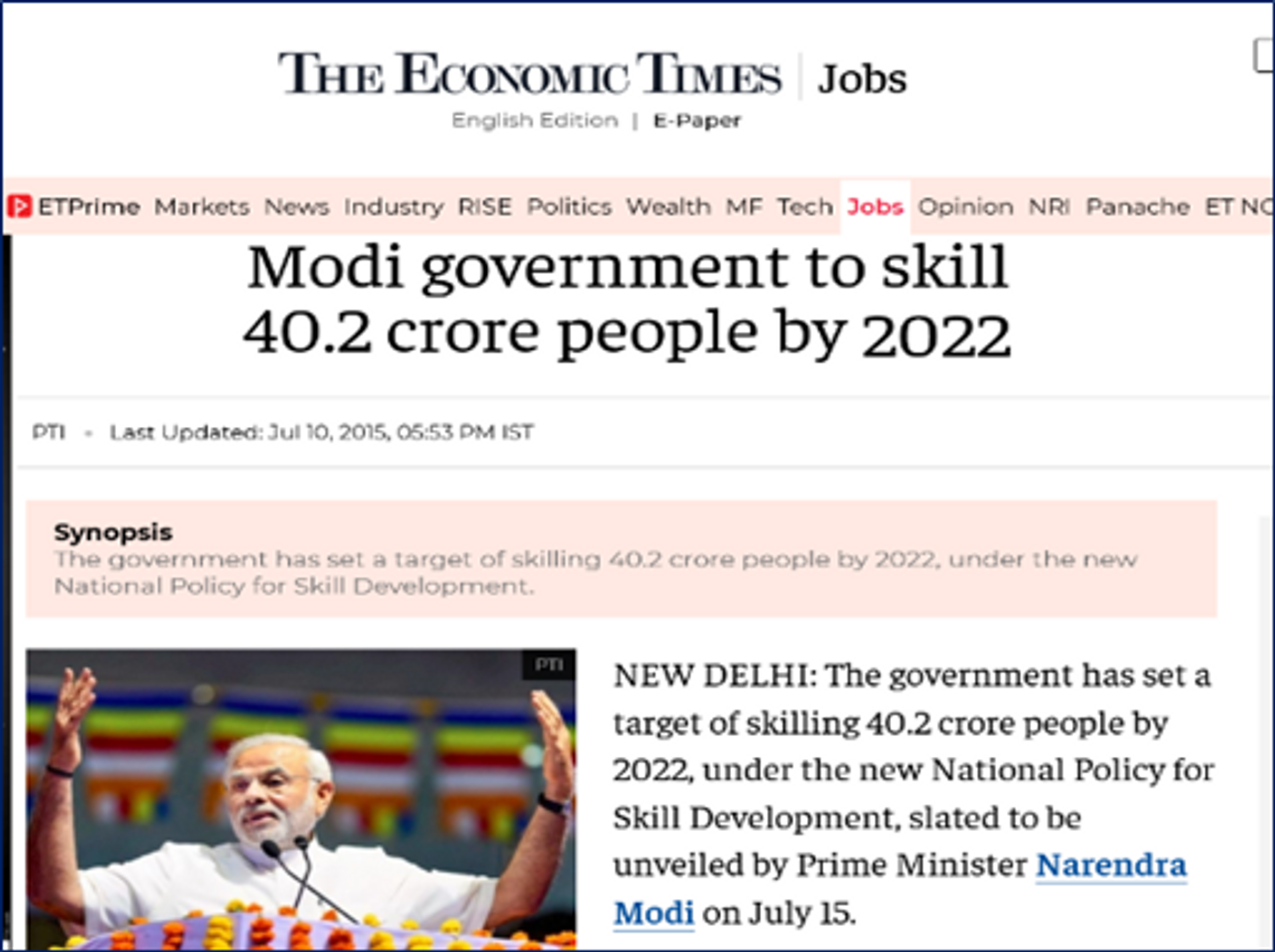 २०१४ में देश में बेरोजगारी की स्थिति भयावह थी। UPA सरकार ने उनकी समस्याओं से अपनी आँखें मूँद ली थी।बेरोजगारों के लिए सिर्फ एक द्वार खुला था। मनरेगा के तहत मिट्टी काट कर सड़क या ऐसी ही कोई निर्माण करना जो अनपढ़ों के लिए तो ठीक था लेकिन पढ़े लिखे बेरोजगारों के लिए अभिशाप। इन सब के अलावे भ्रष्टाचार के चलते उन श्रमिकों की कमाई का बड़ा भाग बिचौलिए तथा सरकारी लोग मार जाते थे।बेरोजगारों में से अधिकाँश के हाथों में ऐसी हुनर या गुण नहीं था कि वे अनेकानेक निजी विभागों में नौकरी पा सके। अतः मोदी सरकार ने एक महत्वाकांक्षी योजना शुरू की जिसके तहत बेरोजगारों को अपनी इक्षानुसार विभिन्न तरह की व्यावसायिक प्रशिक्षण लगभग मुफ्त में दी जा सके जिससे वे प्राइवेट उद्योगो या स्वरोजगार का जीविकोपार्जन कर सके।मोदी सरकार के आने के बाद एक नया मन्त्रालय का गठन हुआ था "Ministry of Skill Development and Entrepreneurship"। मोदी सरकार ने कुल ४० करोड़ बेरोजगारों को कौशल विकास द्वारा साल २०२२ तक व्यावसायिक प्रशिक्षण देने का लक्ष्य रखा था और कमोवेश उसे पूरा भी कर लेगा।