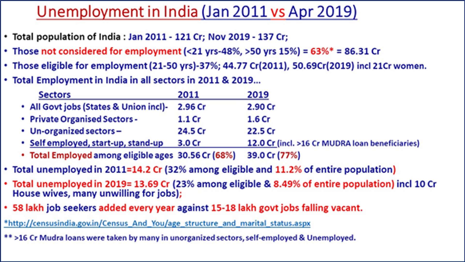 अक्सर ऐसा देखा गया है कि सत्ता के दौरान केंद्र या राज्य सरकारें अपने नागरिकों को रोजगार देने-दिलाने में नाकामयाब और उदासीन रहती है और सत्ता गँवाते ही उन्हें उनकी बेरोजगारी दीखनें लगती है। इसमें मोदी सरकार ही एक अपवाद के रूप में सत्ता में है जो पूरे देश के बेरोजगारों को कौशल विकास द्वारा सशक्त करने में लगी है और लगभग ३३ करोड़ लोगों को सिर्फ मुद्रा योजना के तहत स्वरोजगार दिया भी है (पढ़ें : देश के युवा बेरोजगार क्यों ? https://articles.thecounterviews.com/articles/indian-youth-jobless-unemployed/). I