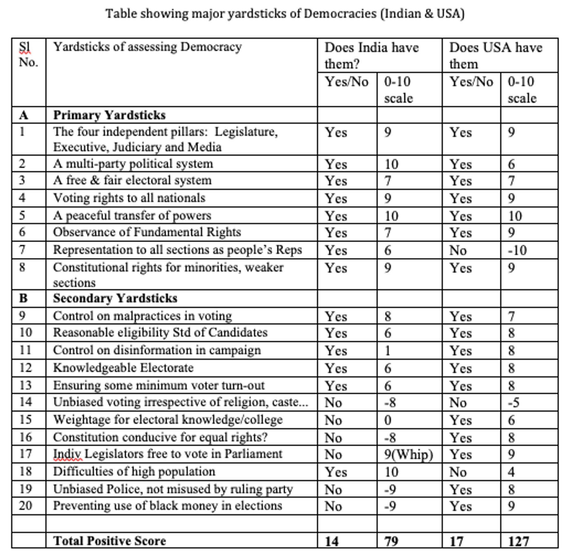 In the present times, many organisations have become a self-appointed jury to judge how democratic a nation is. However, there is no universally accepted criteria. Many of the yardsticks of judging any democracy is full of subjectivity hence, unreliable. Democratic practices in a small country is very much workable but it becomes a horrendous task in most populous country where sizable numbers of citizens don’t know how to exercise democratic rights. The text-box below mentions some of the yardsticks of democracy and a comparison of the world’s largest and oldest democracies as to how they fair. With the parameters in vogue, It will be wrong to compare the democracies in India having >1.4 billion people with that of Norway (5.4 million) or Iceland (0.38 million). There are numerous practical difficulties in governance of such a large populace thru’ democratic norms. table below shows various parameters of a democracy, comparing India to the USA. No doubt, there are flaws in both but Indian democracy has to go long way to compete. Indian constitution guiding its democracy too seems flawed.