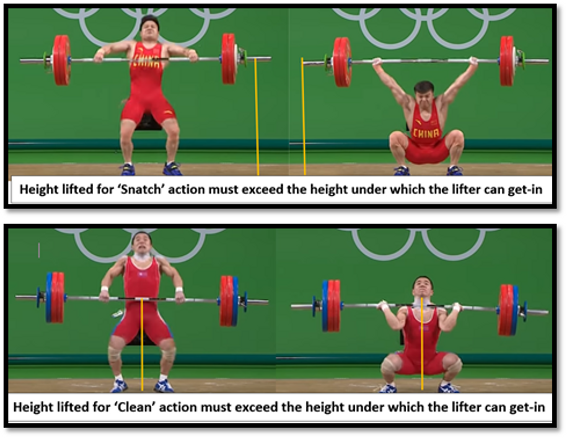 Getting underneath the weight-bar after “clean or snatch” is an art in its skill training. It may be useful to practice the “clean” & “snatch” actions to the max weight initially without actually getting underneath the weight bar without fear of getting wrist/elbow/shoulder/spine/back injuries so often encountered while getting under the bar. It must be understood here that Weightlifting is the most vulnerable non-contact sports inflicting injuries to the extent that the sportsperson may be out of the game for life. Hence, to ward off the chances of injuries, the heavy weight training could be done with safety and free of fear for injuries. This could easily done on a specially designed on the weight suspending vertical bars having multiple notches at every 1 cm or so allowing only one-way upward movement that gets locked immediately the weight bar starts coming down after the complete ‘snatch or clean’ action. Such facility will allow a weight lifter to a fearless, gradually increasing the weight through these actions. The height lifted so, is noted. These heights must exceed the minimum weight-bar height under which the lifter can get in, from where one will be able to get-up with those given weights. This training must be continued till the “clean or snatch” actions of the lifters lifts the desired weight to the required height to a stable squat position and be able to rise-up to lift the weights. Of course, the coach mush ensure that the ‘snatch or clean’ action combines all actions optimally…ie fully extending the knees, hips and the ankles while the upper torso muscles pull the weight-bar to the maimum possible height. A similar platform of vertical bars can be made to practice getting-up from the squat position after the end of the “clean or snatch” actions with the gradually increasing weights. These vertical bars could also be useful for the “Jerk” action after the ‘clean’ to increase his lifting power without injury concerns.