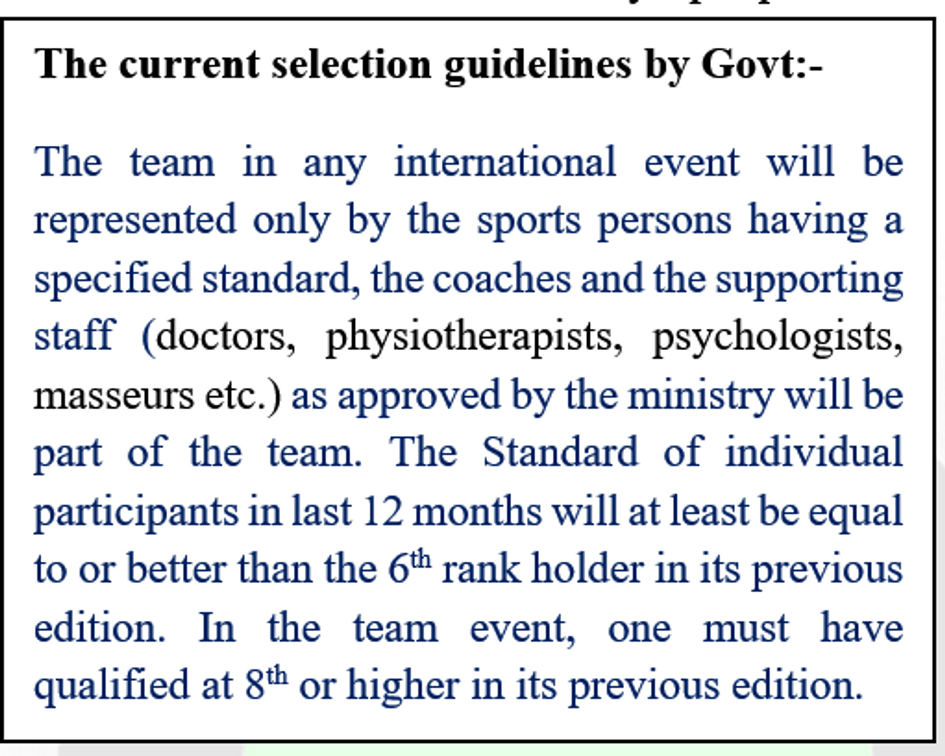 Performance at state & national levels must form the basis for selection of the Olympic probables. A previous Olympics medal winner, may be included in the list of probables without screening but they must undergo selections trials at the national games / special trials to ensure their performance levels are intact. Selection of probable for Physical sports may be “challenged” by any individual demonstrating higher performance at any stage till final selection before the event. Such individual performance will become even better with fine-tuning of the skills in the remaining months of the training.