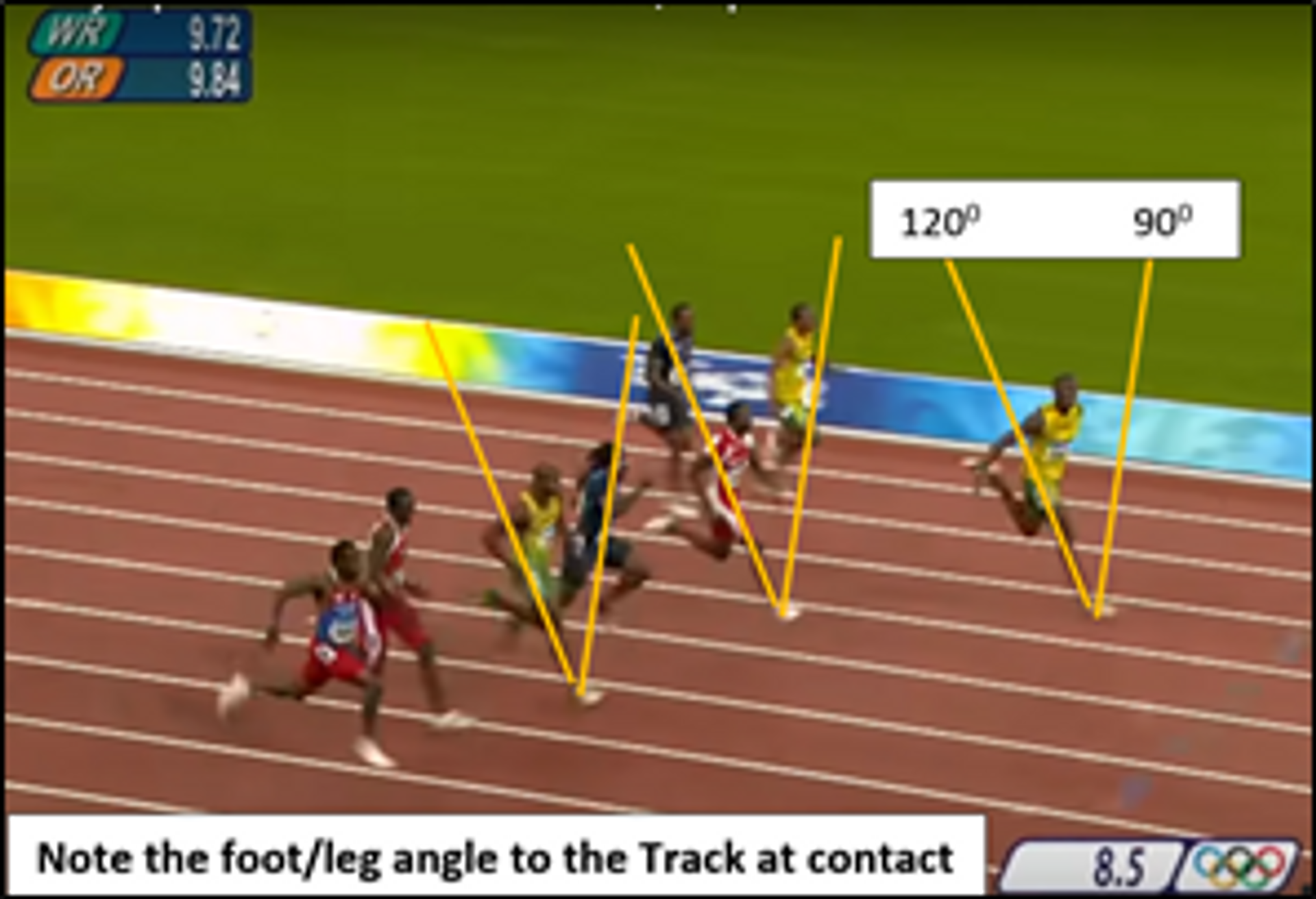 In running/walking sports, distance covered in a unit time is the product of Step (Stridal) Length (SL) x Step (Stridal) Frequency (SF). SL depends on one’s Physique (leg length & strides) and the SF is the function of the muscles & training. Trainers recommend Strides must be optimised with every forward step touching ground at >90 deg but less than 120 deg, in line with the body axis but Olympic 100m finalists invariably show their strides increased to around around 110-120 deg.