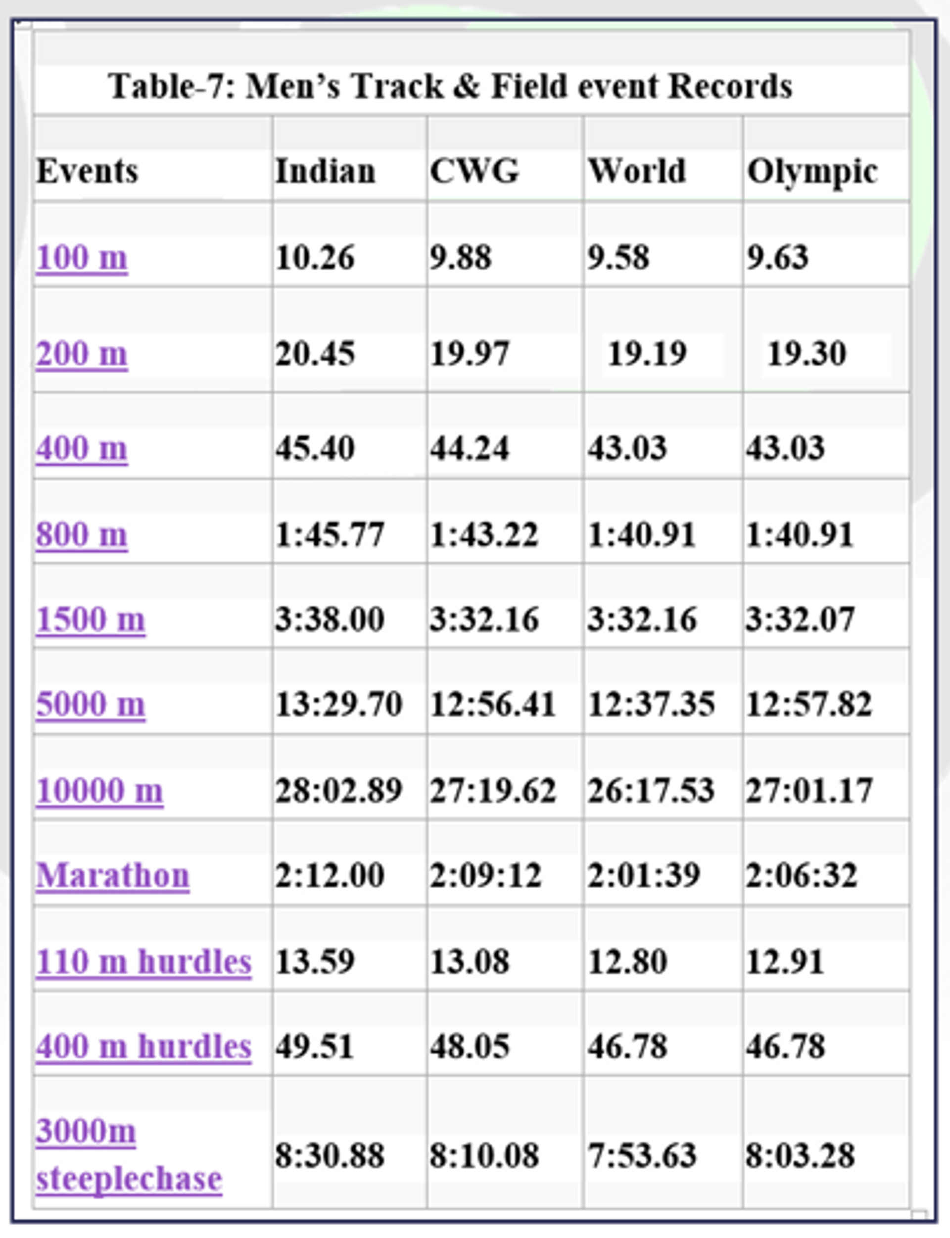 Here comes the Training and Preparations. It all depends upon which championship one is preparing for. In the Indian national games, one of our own athlete will win with whatever time he has. However, in international championship, it gets tough with even fraction of a second counting for podium finish. It gets tougher from national championship to Commonwealth Games (CWG) and finally to the world championship or the Olympics as can be seen in this table-7 (below). It is however, evident that there is very little difference between world & Olympics records. In World & Olympics records, the athlete has to put everything at stake and such performances can only be termed as extreme, the competitive best of the human performance. In order to achieve such best, a very different psyche’ has to be developed both among the coaches and the athletes…focussed to break even the previous event records to ensure a win.