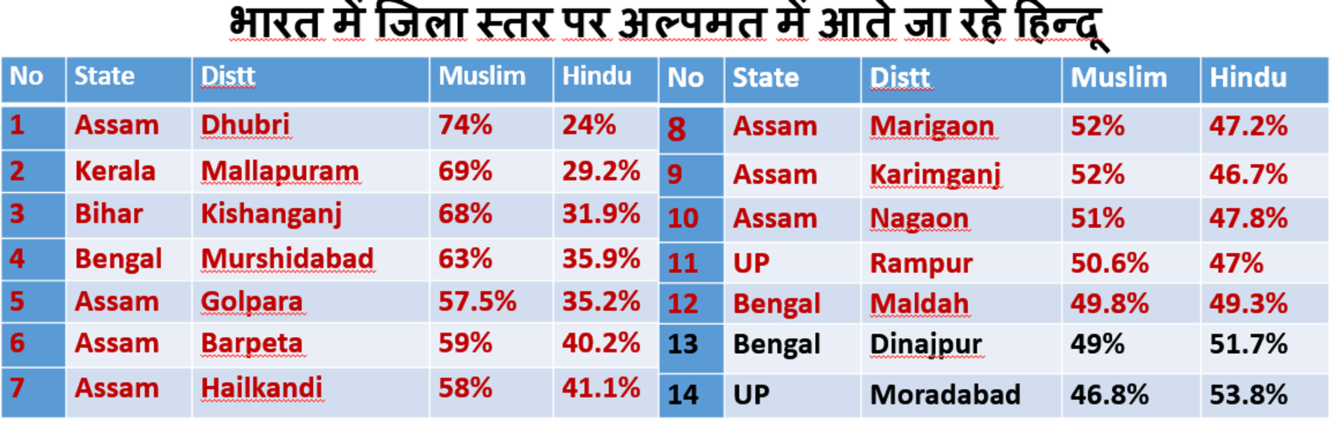 वाह री भारत सरकार और यहाँ की धर्मनिरपेक्षता; और वाह री भारत का संविधान। भारत में ही हिन्दू असुरक्षित हैं। और बिडम्बना यह कि आप 'हिन्दू राष्ट्र' की बात भी नहीं कर सकते। वोट बैंक की राजनीति कर रहे राजनेता तथा उनके वोट बैंक ‘मुसलमान और ईसाई’ नाराज हो जाएंगे। साथ ही सिखों को भी लगता है कि हिन्दू राष्ट्र से उनकी अवहेलना होगी। यह वही स्वत्रंत्रता पूर्व आपस में फूट वाली वाली स्थिति है । भारतीय धर्मावलम्बियों को तो इससे निपटना ही पडेगा अन्यथा पहले भारत के छोटे कसबे, छोटे शहर मुस्लिम बहुल होंगे फिर राज्य और देश का हिन्दू खतरे में होगा I विभाजन के बाद भारत में रह रहे साढ़े तीन करोड़ मुसलमान आजलगभग २१ करोड़ हैं। उनका जिहाद-अल-दावा उन्हे अपनी जनसंख्याँ बढ़ाने के लिए प्रेरित करता है I कश्मीर को तो इस्लामी-कैंसर ने ग्रसित कर रखा है, उसकी बात छोड़िए; भारत के अन्य प्रदेशों के लगभग १२ जिलों में आज के दिन हिन्दू अल्पमत में आ गए हैं और २ जिलों में अगले कुछ वर्षों में अल्पमत में आ जाएंगे। जहाँ भी मुसलमानों के समक्ष हिन्दू अल्पमत में हैं, उन्हें इस्लामी अधिपत्य और जिल्लत सहनी पड़ती है और बाद में पलायन। यह एक चिंता जनक स्थिति है। हमें यह भी नज़र अंदाज़ नहीं करना है कि केरल में सत्ता में आते ही जमात-ए-इस्लामी पार्टी ने उत्तर केरल में सरिया क़ानून लागू कर दिया था। अतः मुसलामानों का ध्येय साफ़ है। जनसंख्याँ बढ़ाओ और इस्लाम लाओ। २०१४ में ISIS का सरगना अल-बग़दादी ने तो दुनिया को खुले आम चुनौती दे दी कि पूरा विश्व इस्लामिक खलीफत बनेगा। तो भारत को भी इस्लामिक बनाने के लिए यहाँ के मुसलामानों में सुगबुगाहट तो है बस संख्यां में अभी कमी है। तो उन्होंने तय कर लिया है, अपनी आबादी बढ़ाओ, बाहर से आए मुसलमान घुसपैठियों को भी आश्रय दो जिससे यह देश मुस्लिम बाहुल्य हो जाए ।