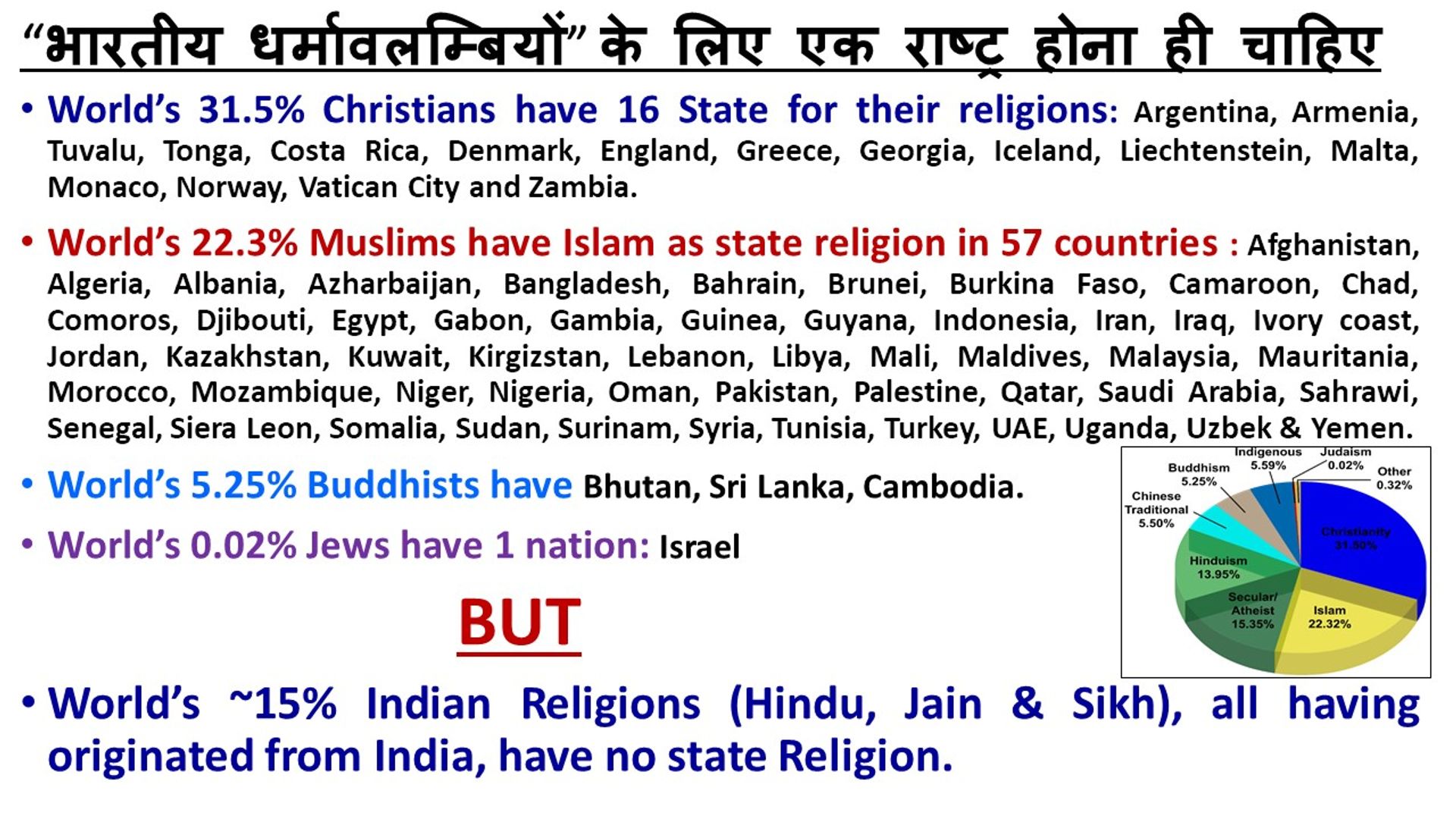 पकिस्तान तो मुसलमानों के लिए बन गया परन्तु गांधी और नेहरू ने भारत को ‘हिन्दू’ या ‘भारतीय धर्म’ वाला राष्ट्र नहीं होने दिया। कारण ? मुसलमान और ईसाई नाराज़ हो जाते। लेकिन इसका नतीजा क्या हुआ ? भारतीय धर्मावलम्बियों के लिए आज कोई भी अपना देश नहीं है। आज विश्व के २३ % मुसलामानों के लिए ५७ देश, ३२ % ईसाइयों के लिए १६ देश, 5% बौद्धों के लिए तीन धर्म-परस्त देश हैं लेकिन भारतीय धर्म के लिए ठन-ठना-ठन। कुछ भी नहीं।