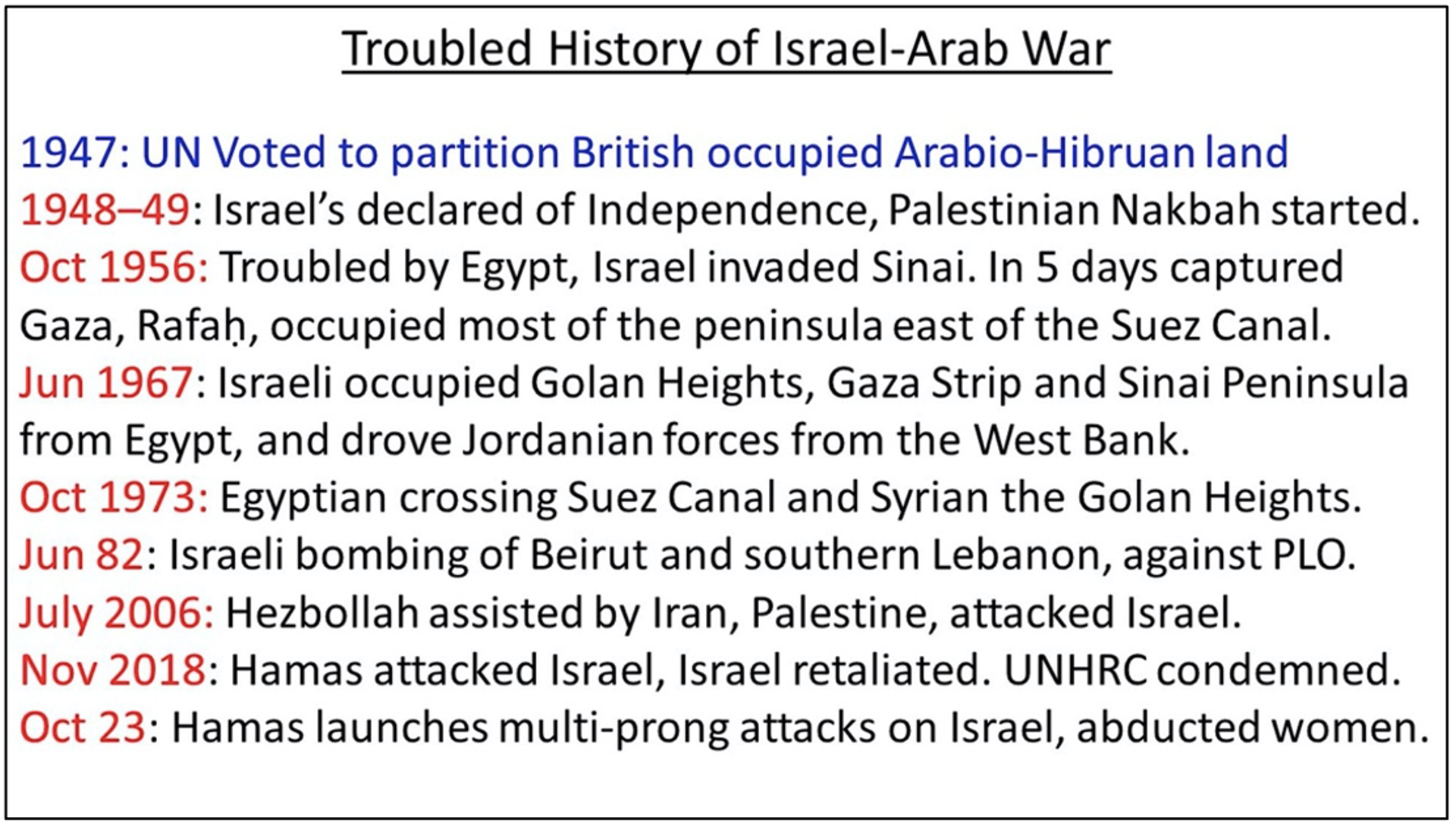 Iran had declared on 01 Apr 24 itself that they will retaliate Israeli attack on their Damascus Embassy that killed their senior military commanders and several others. The threat was credible; firstly, because it had been issued by Iranian radical religious head Ayatollah, secondly that it came as a response in which Iranian military generals were killed and last but not the least, Iran had been long looking for an excuse to attack Israel. There are several corroborating geopolitico-religious factors too. It is a geographical fact that all Islamic nations have been against the very formation of Israel in 1948. Further, Islam sees Jews as Kaffirs occupying their land (although these were Jew-land before Islam was founded) drawing inimical actions/religious war (jihad) for re-capturing. It is other matter though that they received enormous drubbing by Israel in all those wars. The current Israel-Hamas war was initiated allegedly by Iran through their Hamas wing of terrorists on 7th Oct 2023. Israel considers Islamic Jihadists as a threat for their existence and vows to incapacitate Hamas to an extent that they will not be able to mount another attack in future. A long history of Arab-Israel war is summarized below:-