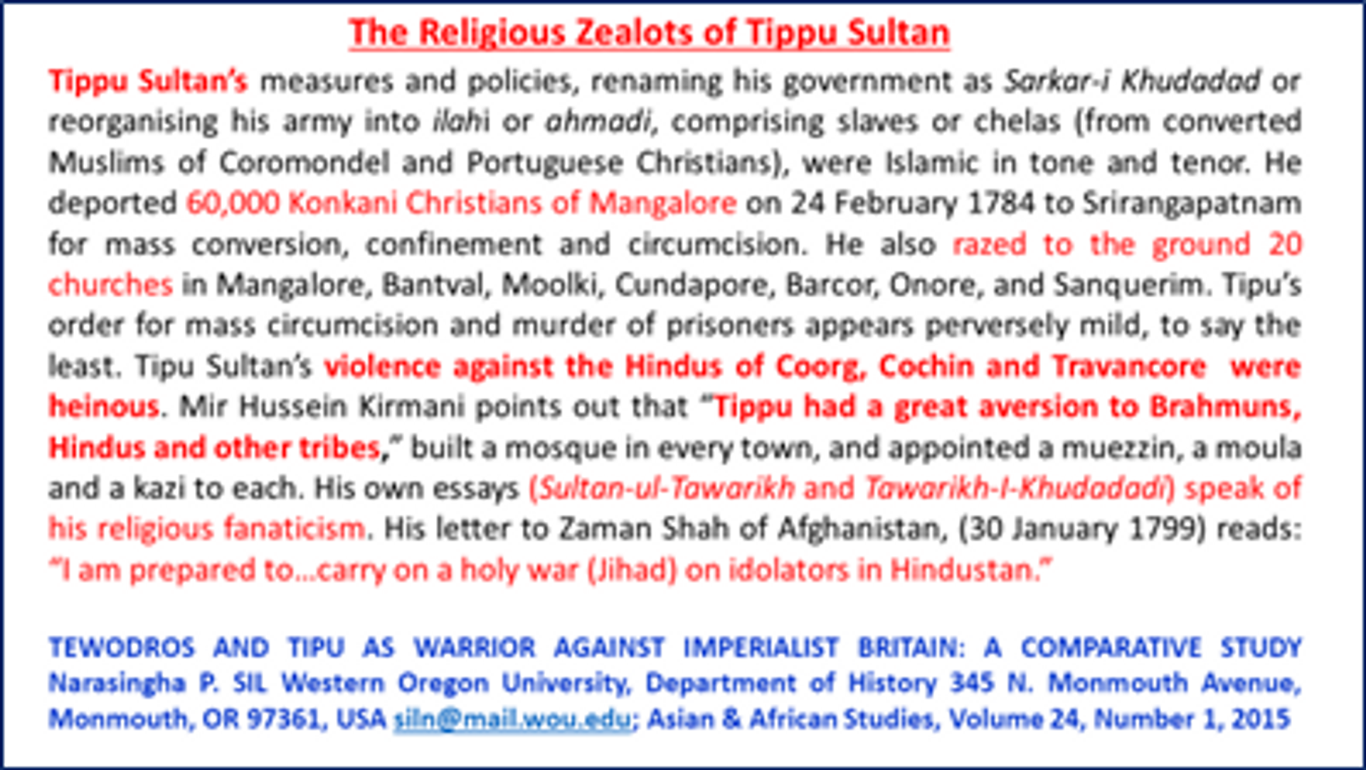 Almost all of the Muslim rulers who came to India incl Tipu Sultan, wrote back to their masters and caliphs in Arab that they were killing the idolater Hindus for Islamic Jihad.