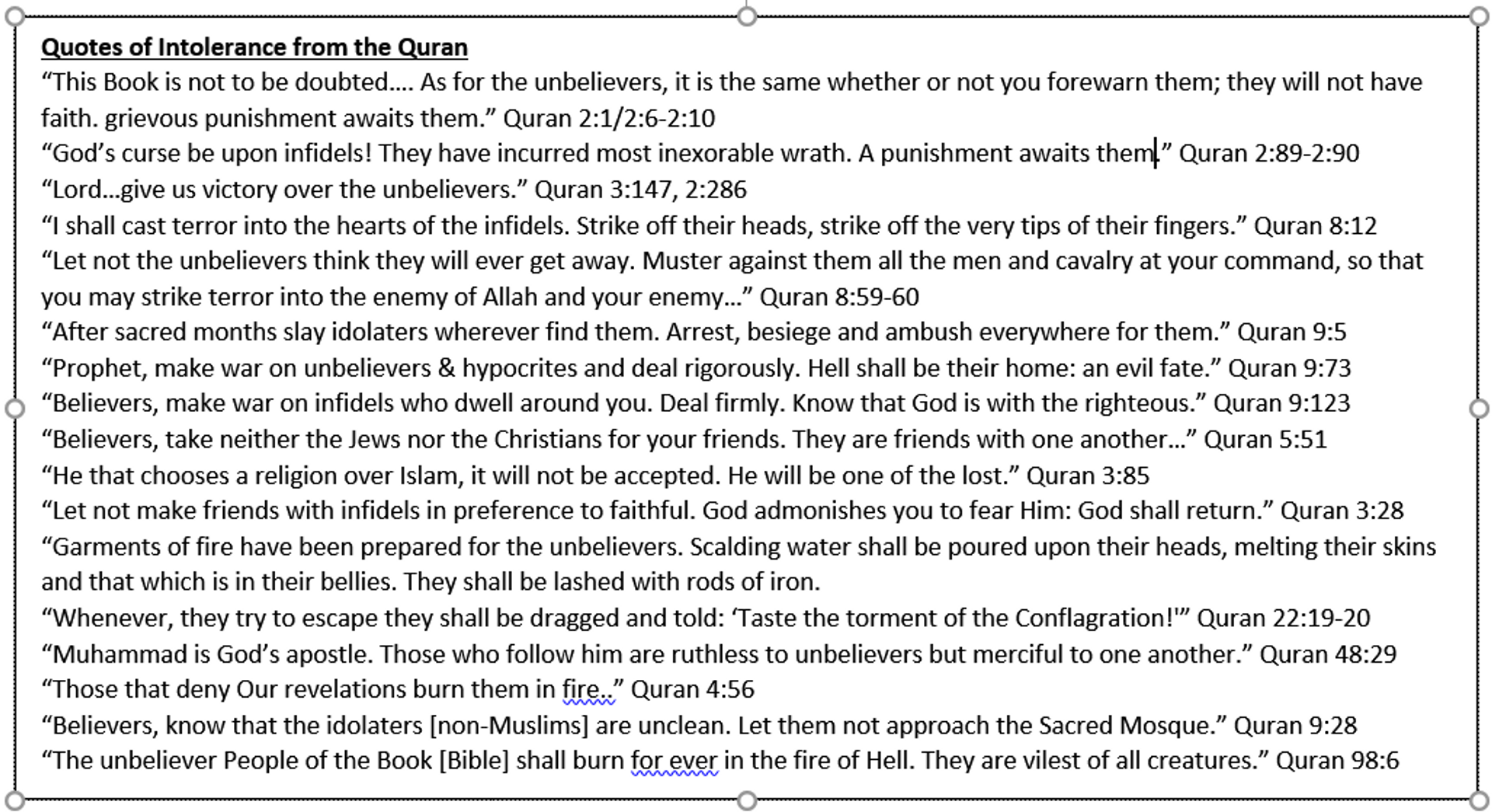The answers to all the above queries are simple…that hate and intolerance against the believers of other faiths and religions is enshrined in Quran believed to have been dictated by Mohamed. A very precise account of Islamic hate is published in the article “Islamic hate, intolerance, bigotry & fascism and the Global Islamic Caliphate).