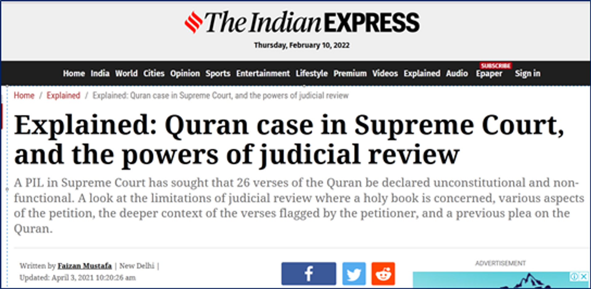 There is no doubt at all that Quran spews venom against the believers of other faiths or religions. It terms them ‘non-believers or Kafirs’ and put them in a category drawing inhuman treatment and punishments. Mr Rizvi had approached the apex court to remove (or at least amend) only those 26 verses from Quran. However, there are at least 60 such verses in Quran which spit hate ( 60 Hateful and Intolerant verses of Quran; The Counterviews; Issue 4:03). Some of these are placed below but all those 60 verses are narrated in the article mentioned above:-