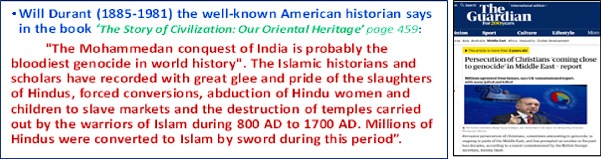 One may wonder why Mohammed, whom Muslims consider a prophet, committed genocide of dozens of Arabian Tribes. One may also wonder why the subsequent Khalifs of Islam committed Genocides of Jews & Christians. The world is mutely asking a question to Human Rights as to why Khalifs of Islam committed the heinous genocide of the Parsis. And the worst of all…as to why the Muslim rulers who invaded India, committed repeated genocide of the Hindus.