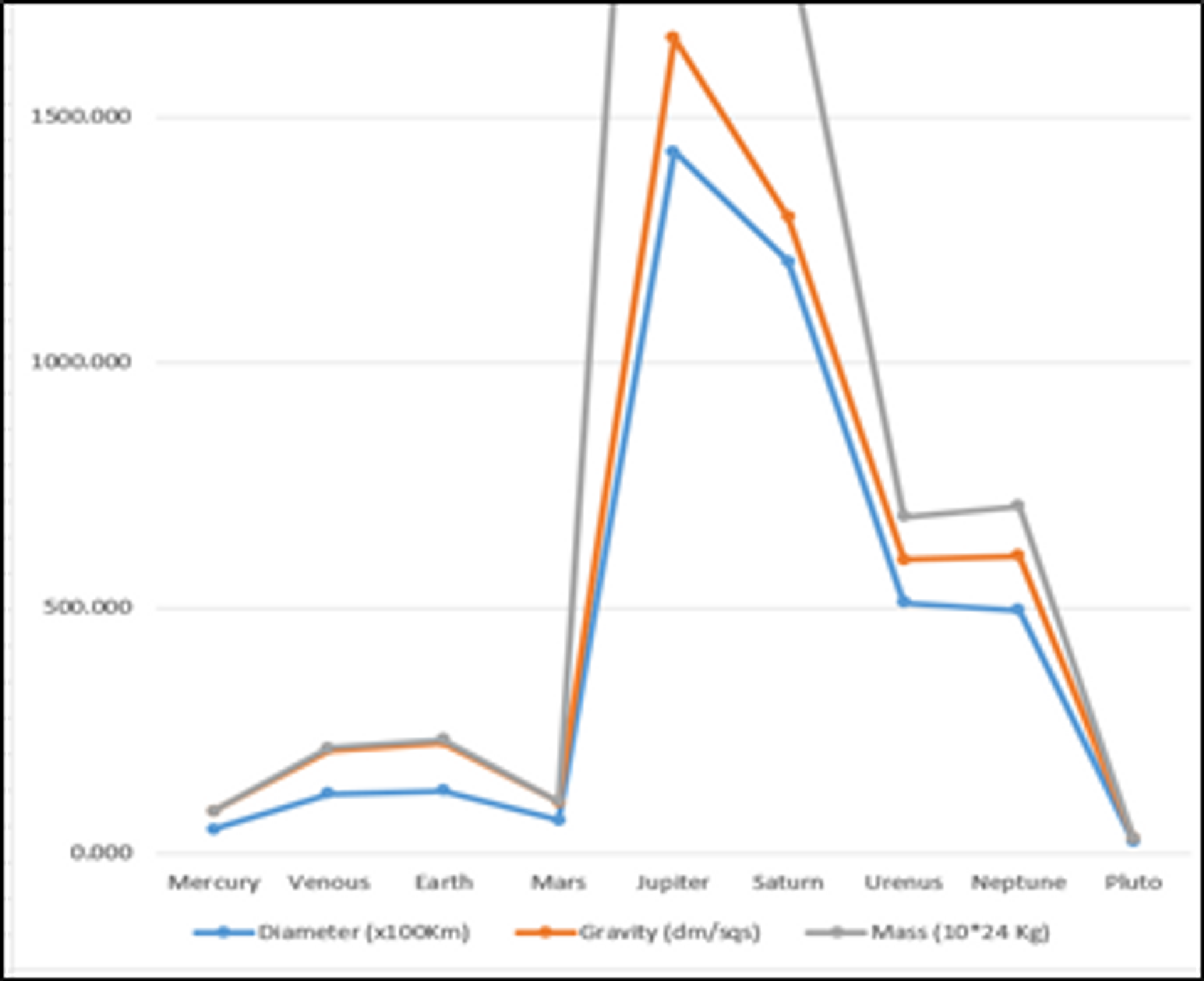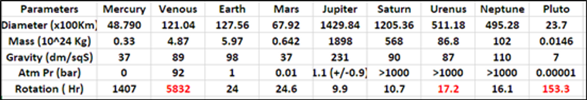 The relationship among various parameters of the planets in the Solar system also seems to be very mysterious, defying some of the known logic; or maybe we know very little to comprehend the cosmic science and events applicable in them. The atmospheric pressure on planets do not seem to be universally related or applicable to the parameters of diameter, mass, density, gravity, temperature, rotation and so on as could have been expected. Most of us tend to apply the scientific logic of gravity and to the Atmospheric pressure but as can be seen in the table below, it is not. Otherwise, Venus, Saturn and Uranus could have had similar or comparable atmospheric pressures as that of Earth as shown in the table below. Planetary rotations of the planets are shown in red, represent counter-clock (to Earth) west-ward rotation. There is just one correlation of planetary parameters that is apparent, in their mass, diameter and gravity as shown in the graph opposite that follows a similar trend