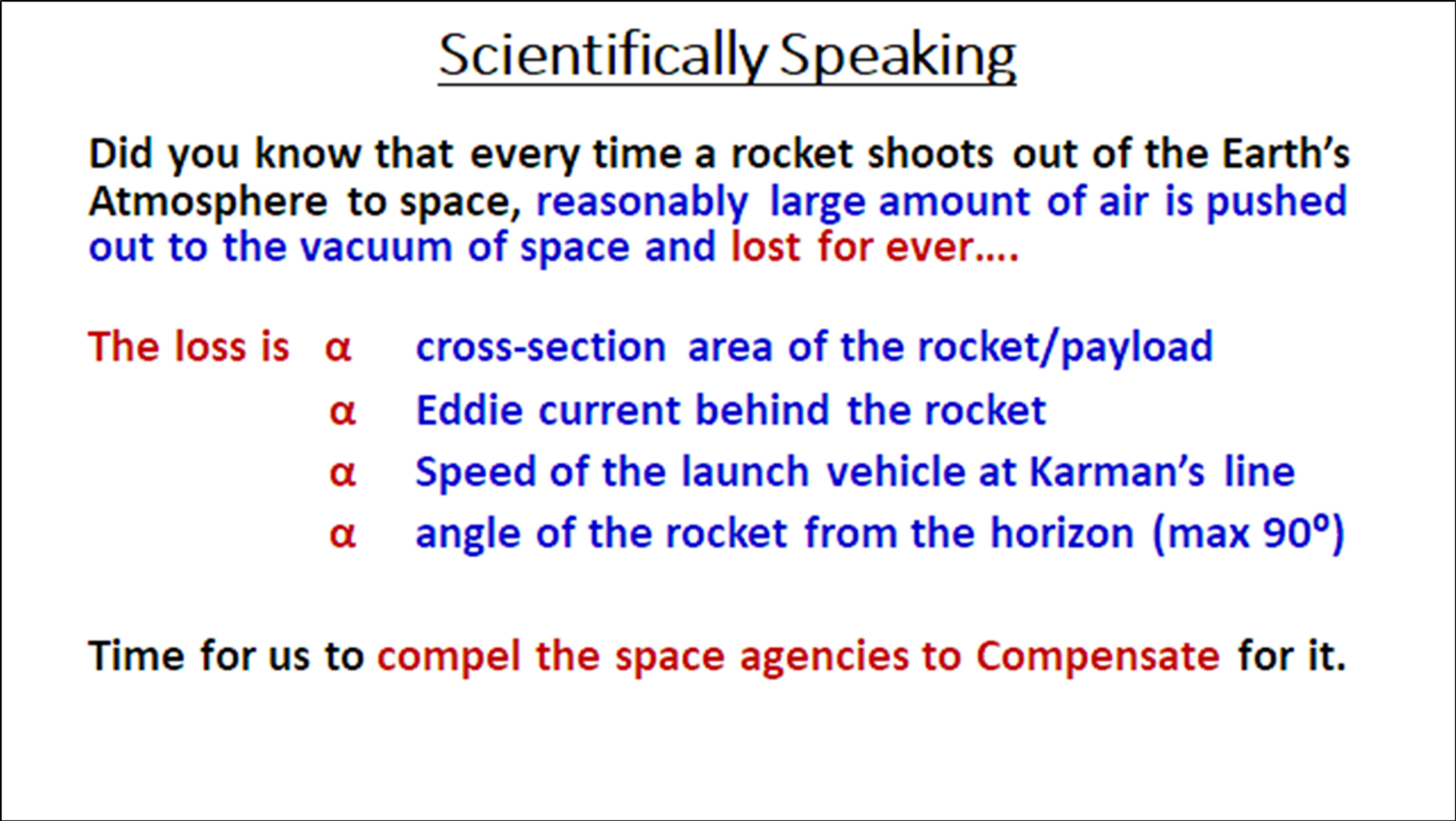 While environmentalists the world over are rightly concerned about the climate changes, very few are aware of the multiple holes that the heavier and mightier rockets and missiles are drilling in our atmosphere as explained above. Every rocket heading to space are presently pushing out a large mass of air due to Shock waves. Similarly, Splash effects also cause atmospheric losses. There are ways and means to minimize such losses. Time has come when all activists of the environment must come together and take effective steps unitedly so as to make our Earth, the only inhabitable planet to the best of our knowledge in the cosmos, a safer place to live. None should be allowed to damage the atmospheric cover of the Earth.