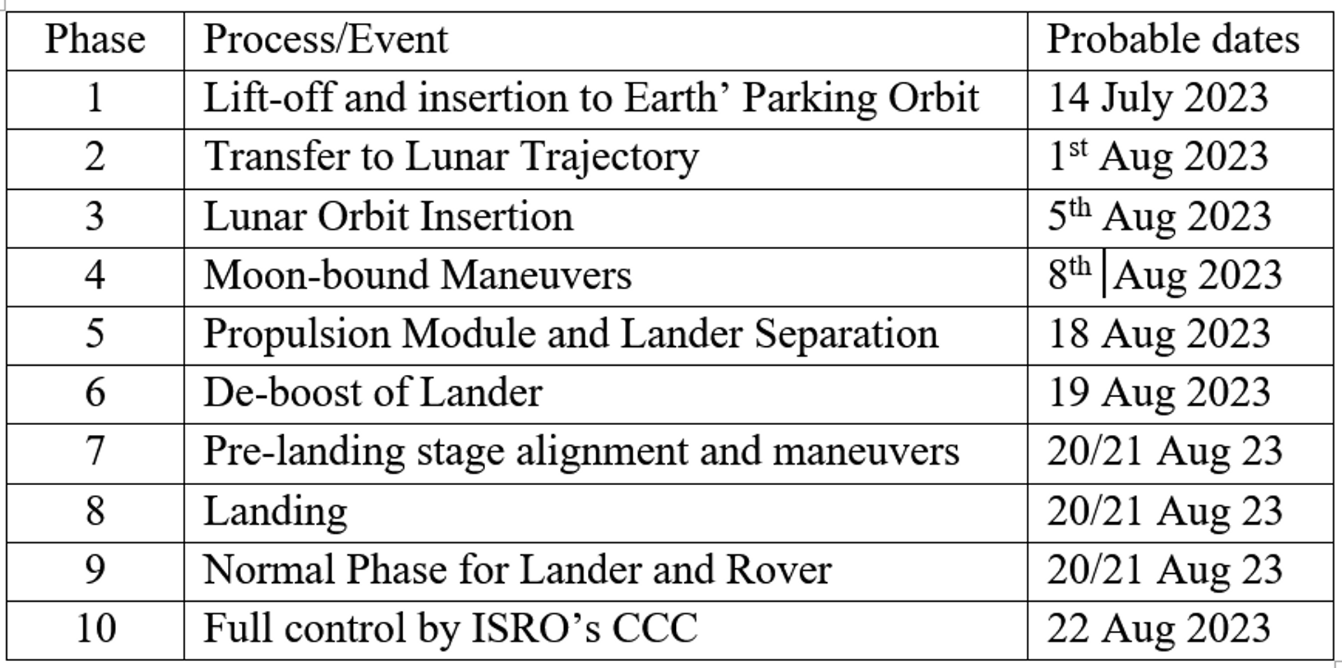 As mentioned above that TLI marks an important phase, all subsequent phases are dependent on it and so are the probable dates. It will be the course of action on Trans-Lunar Injection of Chandrayaan 3 that will decide on the subjective dates. Once precisely placed in the 100 x 100 orbit, there is no problem even if it is delayed for landing. Landing can always be delayed by one Lunar day to coincide with the Sunrise over the designated spot of landing.