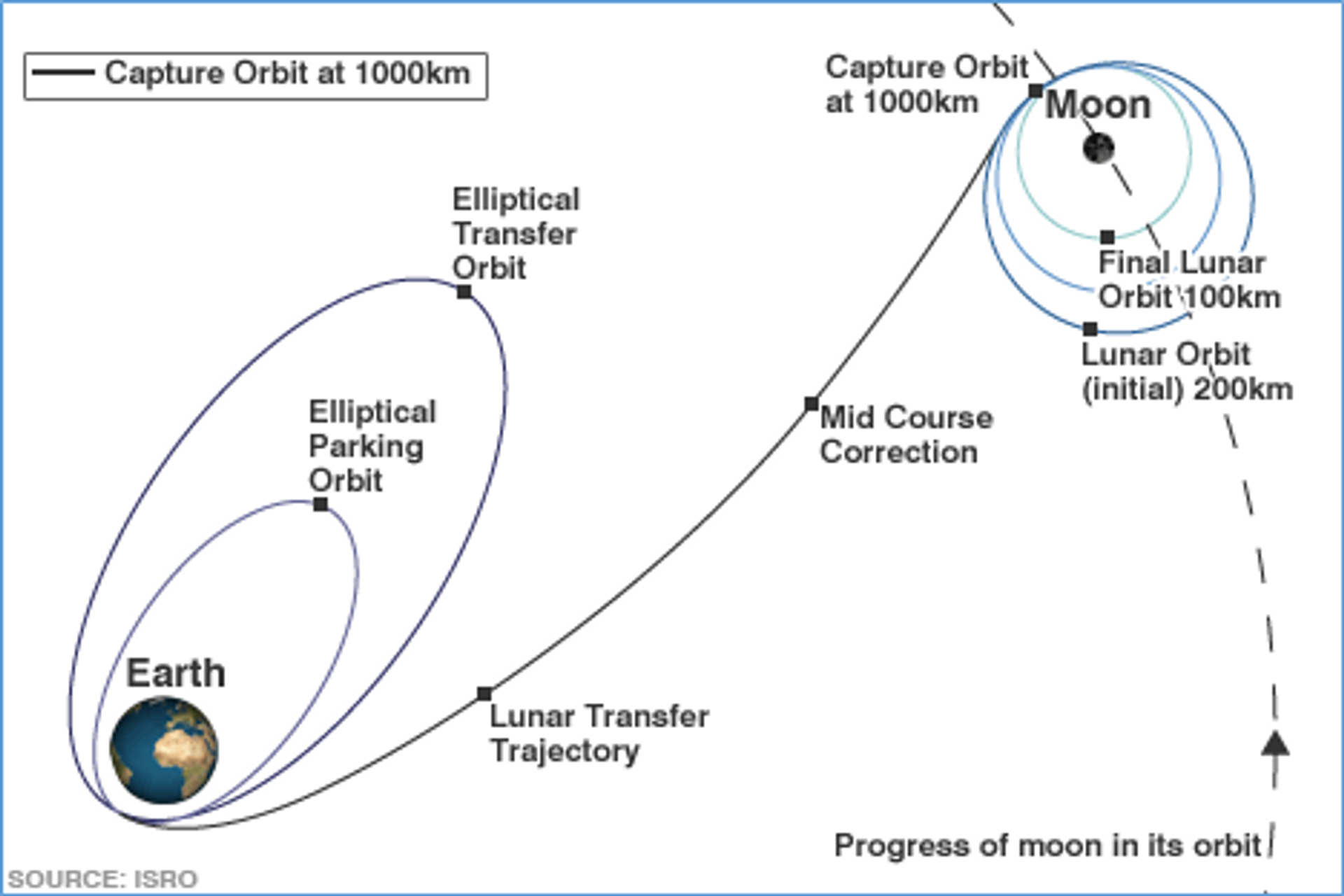 From the present 170 x 36500 Km, the orbit is expected to be raised gradually through various Orbit Raising Maneuvres (ORMs) to approx 230 x 45,000, 250 x 55000 Km, 270 x 70000 Km, 250 x 90,000 Km and 225 x 1,40,000 Km. The author reiterates that these are approximate values. On the day of directing the payload to the Moon on the Lunar Trajectory, its velocity will be increased through a final sling-maneuver at just above Earth’s Escape Velocity (~11.2 Km/Sec) and put on to the Lunar Trajectory Orbit (of 225 x 4,00,000 Km or so) through the operations of the perigee motors. The velocity for Lunar trajectory will be in the proximities of 11.4 Km/Sec. This velocity will keep washing out gradually by Earth's Gravity and by the time it reached Moon's Gravity influence Area, Chandrayaan Velocities would have dropped to approx 0.5 Km/Sec.