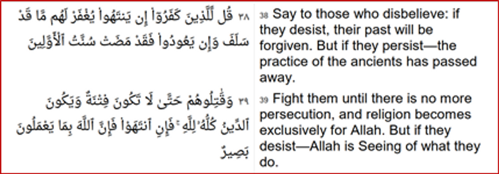 Expansionist and Intolerant faith. Genocidal approach by Mohamed and later Islamic Caliphate in anarchic Arabia of 7th century and later into Christian and Jew population was condemnable and that too, just to expand Islam because he personally hated others. His genocide committed against Parsis in 651-52 CE was to the extent that only a handful of them could survive after fleeing to Bombay and Gujrat. Radical and Jihadi Muslims of the world somewhat believe their Mullahs who misinterpret Quran on the pretext of a few verses in Quran (mentioned below) and ask them to continue fighting till global Islamic caliphate is established. This is something which has put Islam at odds with most other religions and faiths the world over, trying to reign supreme over all others. This must end.