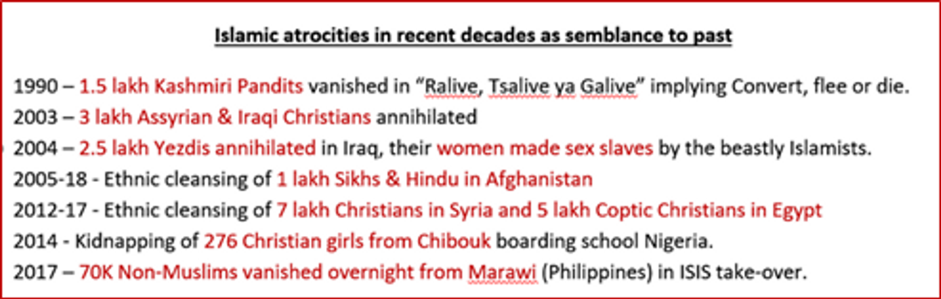 In the 20th century, several Muslim attacks on Indian Hindus strengthen the belief that Islam was, is and will always remain inimical to them. Mopilla genocide of 1921-22, Kohat riots of 1924 in NWFP, Noakhali killings of Hindus in 1946 and genocide of Kashmiri Pandits in 1990 only strengthen this belief (read “Looking Back at Ralive, Tsalive ya Galive : January 1990 Genocide of Kashmiri Pandits”; https://articles.thecounterviews.in/articles/ralive-tsalive-ya-galive-january-1990-genocide-kashmiri-pandits/). It must be acknowledged that some of their killings also caused retaliation by Hindus BUT those were only reaction to their actions. Islamists’ genocidal intent and acts are not confined to Hindus. Immense Hindu sufferings under Islam may be the reason of why so many voices for the UNHRC actions against intolerant & barbaric Islam are emanating from India. It is not without reason though. Occasionally such voices of anguish appear to some as Islamophobia but it is not (read “Factual Islamophobia in the World…; https://articles.thecounterviews.com/articles/factual-islamophobia-in-the-world/).