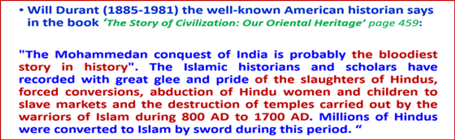 The erstwhile 9.8% Muslims of India in 1951 are now near 20% (incl the illegal Migrant Bangladeshi and Rohingya Muslims), fast changing the religious demography of the nation. Native Hindus in Muslim majority localities are being threatened to convert of flee. This has angered the native Hindu community who are gradually adopting a tougher stance to prevent another partition like situation in India (read “विभाजनविभीषिकाऔरभारतीयधर्म” https://articles.thecounterviews.com/articles/indian-partition-and-indian-religions/). Once in substantial percentage population, they start disregarding national values… law of the land, favour Islamic separatism and terrorism…and favour the Islamic law ‘Sariat’. Hindus having already faced the worst kind of Islamic barbarism (quoted below) for over 800 yrs, are firm in not allowing Islamic domination again.