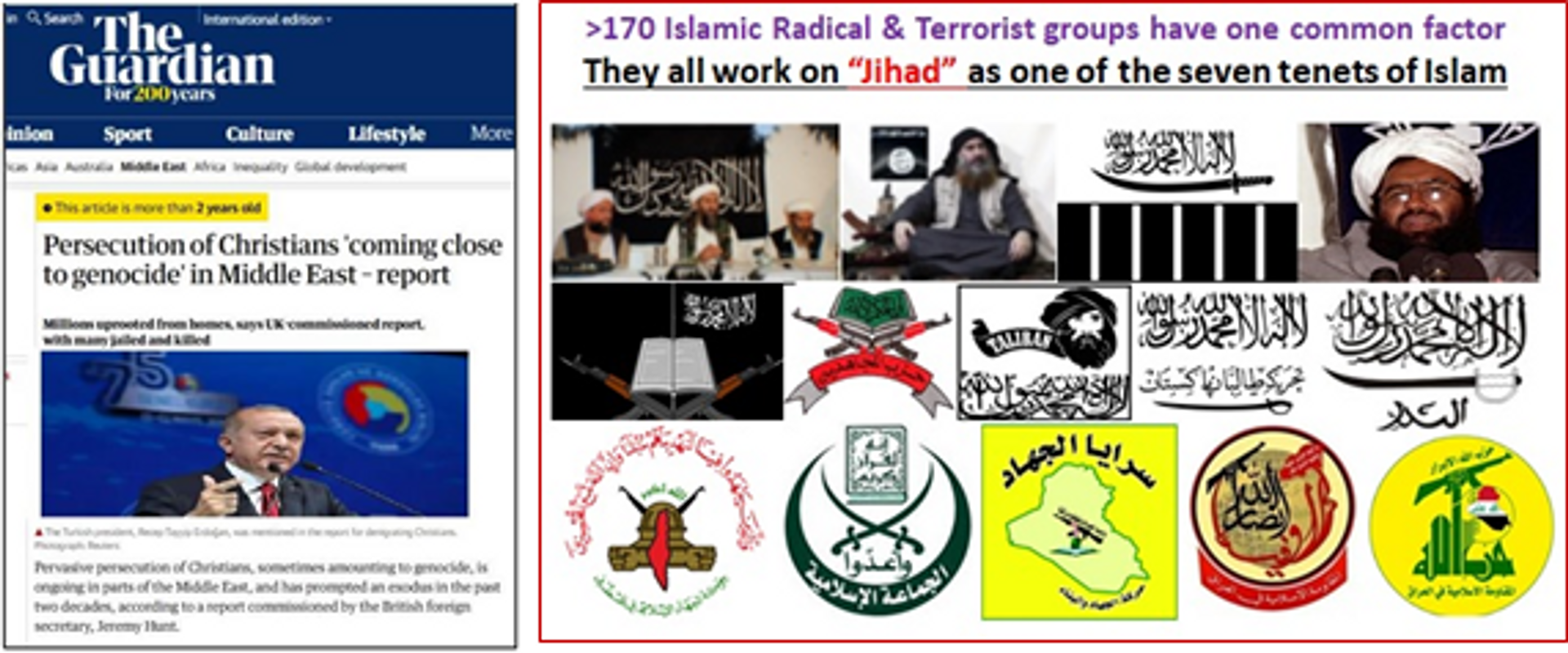 In the Middle-East, the handful of remaining Christians are being persecuted by various Islamist groups for decades now. These persecutions are amounting almost to genocide as reported by a fact-finding commission under British Home secretary Jeremy Hunt. In fact, many of the Christian groups are caught in the cross-fire of the ongoing Sectarian violence of various Islamic Jihadi groups fighting among themselves like the Sunni vs Shia and so on. Almost all factions of Islam have adopted an aggressive and violent path to prove themselves as the real Islamists based upon the teachings of Quran. This has resulted in >170 Jihadist organisations fanning out in the Islamic nations, committing atrocities on both Muslims (of different sects) and non-Muslims in order to impose own ideologies.