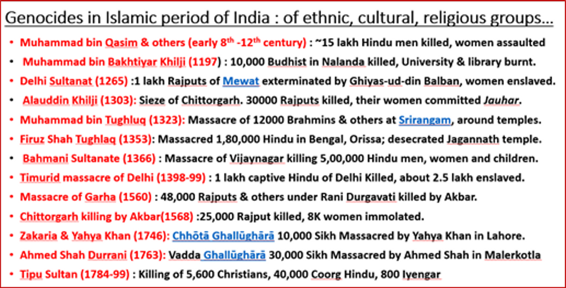 Presently, Islamic intolerance against non-Muslims has become more prominent because of ISIS cleric Al-Baghdadi’s call for a global Islamic caliphate in 2014, to convert the entire world in to Islam. This requires smothering of all other religions, prominent among them the peace-loving Hinduism, Buddhism, Jainism and to large extent, Christianity. Christians of course, retaliated through Crusade in the medieval past when it became too much BUT Hindus/Sikhs have not retaliated despite numerous genocides. Hindus experienced these extremely painful ordeals in medieval times as well as during pre-independence period (a few such acts are mentioned below).