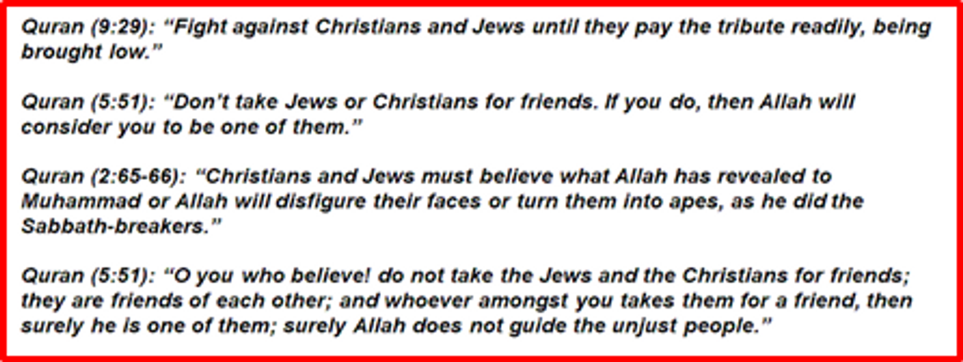 At hindsight however, there are reasons for the hate in Quran. Islam was founded by Mohamed in 7th century and imposed on the sparse masses of numerous Arabian Tribes in nomadic Bedouin ‘kin-related groups’, with each clan having own chiefs on whose patriarchal dictats their tribes acted upon. These nomads largely served as bodyguards to escort the caravans of larger groups trading with distant towns. Frequently raiding and looting other tribes for animals, women, gold, fabric were the commonly accepted norms. Whatever were the reasons, Mohamed forced his new faith called Islam, through a dictat of “Convert, Flee or Die” willingly through canvassing, else at the point of swords. What followed was a complete annihilation of those disunited tribes and civilisations, robbing them of their faiths. This is what the UN Human Rights defines as Genocide. Mohamed himself as warrior chief, led numerous such genocidal attacks on the groups who refused to accept Islam (read “Islamic Hate, Intolerance, Bigotry & Fascism and the Global Caliphate”; https://articles.thecounterviews.com/articles/islamic-intolerance-bigotry-fascism-global-caliphate/).