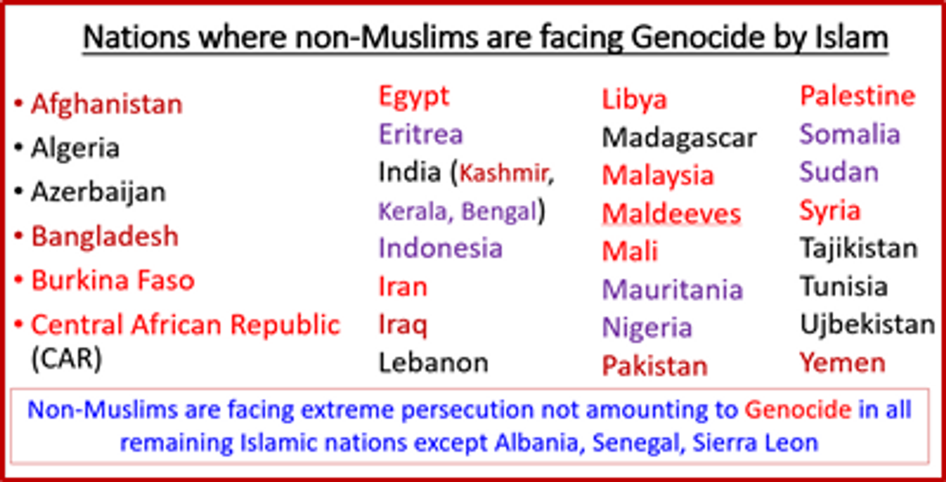 The United Nations Human Rights Council (UNHRC) in recent years and decades has become a mute spectator to the continuing atrocities and genocides by Islam esp in Asia and parts of Africa as mentioned in the text box below (text in red show extreme persecution).