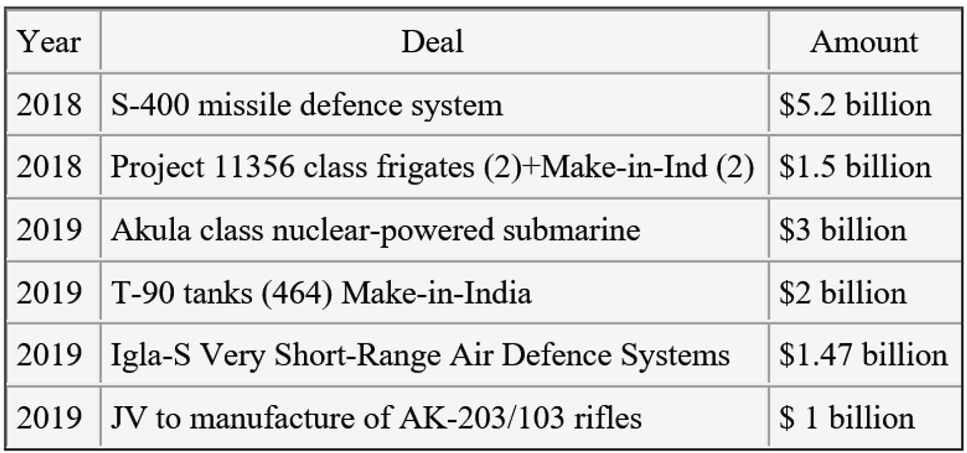 Trade Relations of Crucial equipment. India has also been dependant on USSR/Russia for its Defence sector. USSR supported India with many technological knowhow in setting up many industries esp Energy sector, Military hardware (incl MiGs, Su-30, Antonovs, Ilusins aircraft, T-90 tanks and submarines), machineries, Steel and Aerospace among others. A need for advanced technologies in defence mandated diversifying when military hardware from Britain, France, Germany etc were also resorted to. American equipment was introduced in the recent decades when political relations eased with them. In the recent decades, trade volume with Russia did decrease but in 2018-19 it picked up again esp in Defence sector. After Russians apparently improved their military trade relations with Pakistan (MI-35 Hptr, JF-17 Engines, Joint Military exercises etc), India looked it with suspicion with a bit cold shoulder.