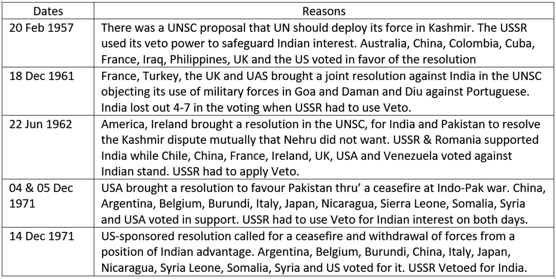 Russia helping India with crucial Vetoes at the UNSC. The reasons why India should side with Russia are several. Among these, some of the pronounced reasons include Russia with its Veto coming to the rescue of India six times in past when cornered at the UNSC. Besides the Veto, USSR and Russia has stood-by India in most of the UN/UNSC/HRC voting. In most such instances, USA and Europe were against India.