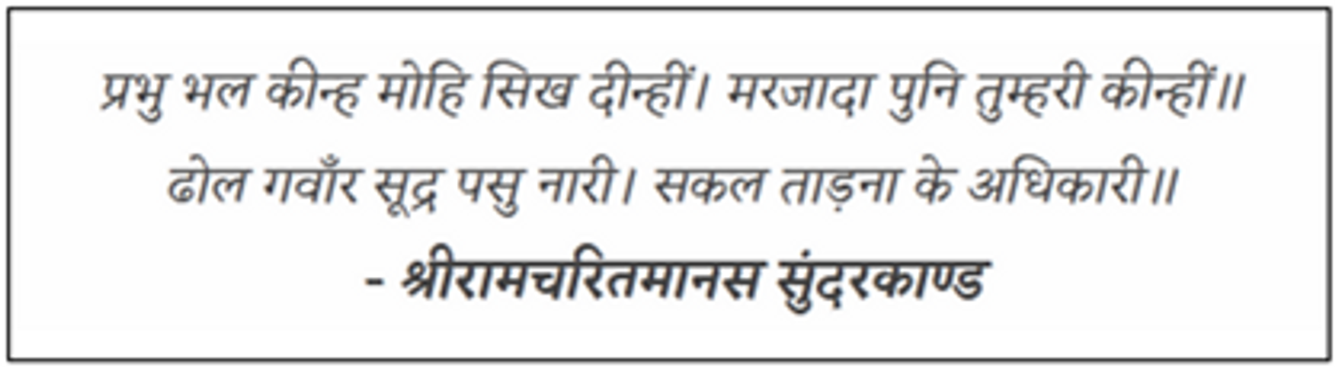 The extent of making the women obeisant varies in different countries depending upon the culture of their original faiths from where they were made to convert. Leaving exceptions, people of Indian Religions have been peace-loving and treating their women with respect. Veda, the foundation of humanity gives women the same status as that of men. In the specific roles of mothers, women have even higher socio-spiritual status. It was much later when some basic rules of introducing discipline for women were incorporated that we find in the ‘Manusmriti’ too. Islamic teachings give the patriarchy the authority to discipline or even beat their girls/women if disobedient. Over 600 years of Islamic atrocities in India introduced several ills in the social upbringing and discourse of women. Some of the stereotypes of Muslim women have been also visible in Hindu women too in recent centuries. Ramcharit manas written by saint Tulsidas during the Islamic period in India shows degradation in the social fabric when manhandling was subscribed against women especially in disciplining them, safeguarding their modesty in own interest: -