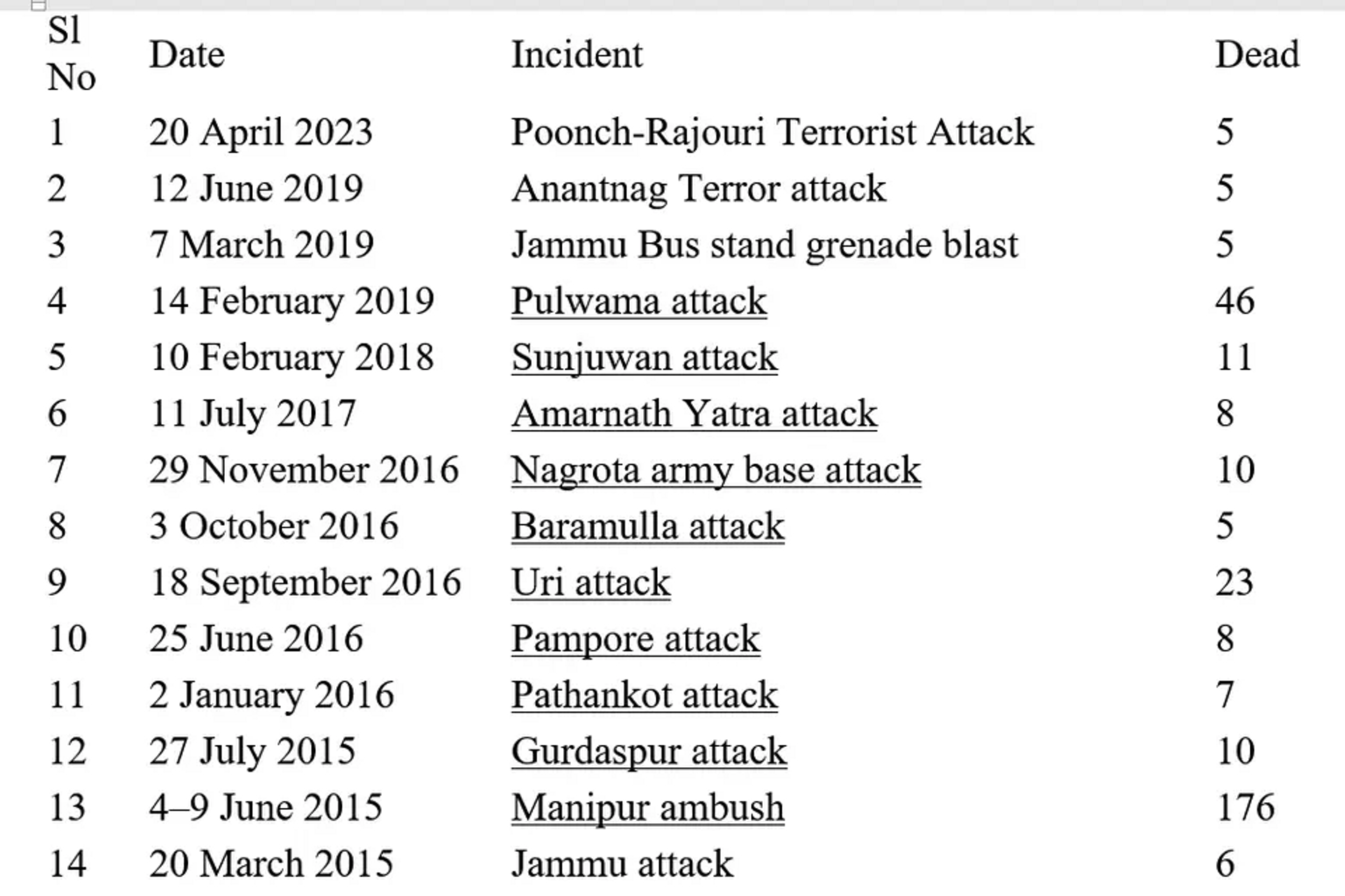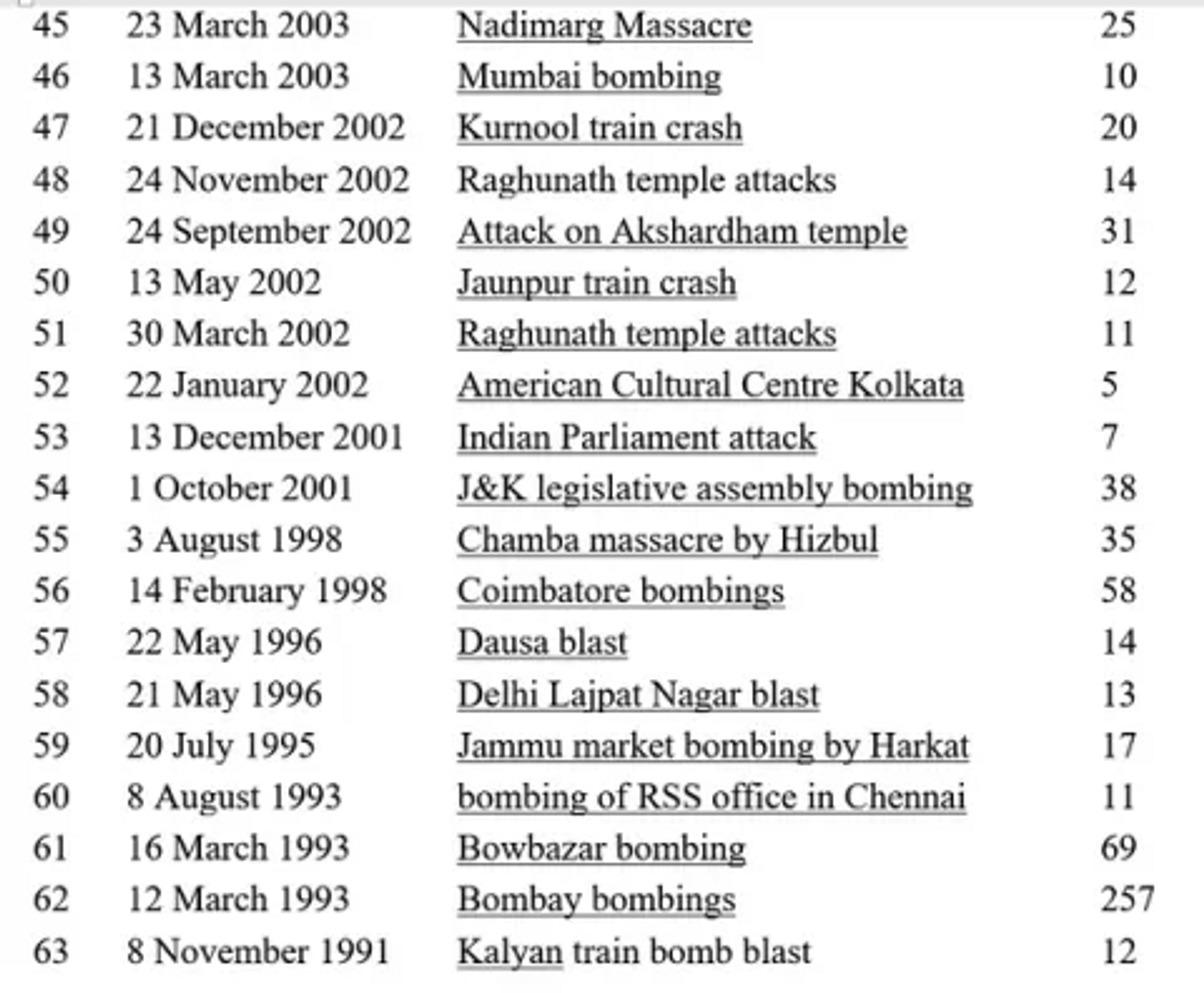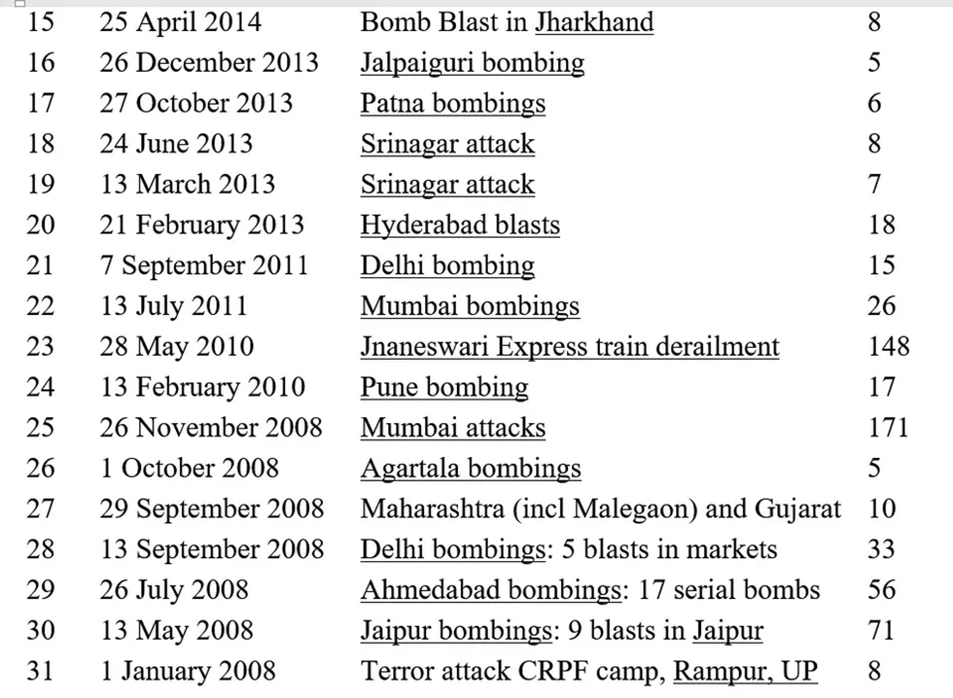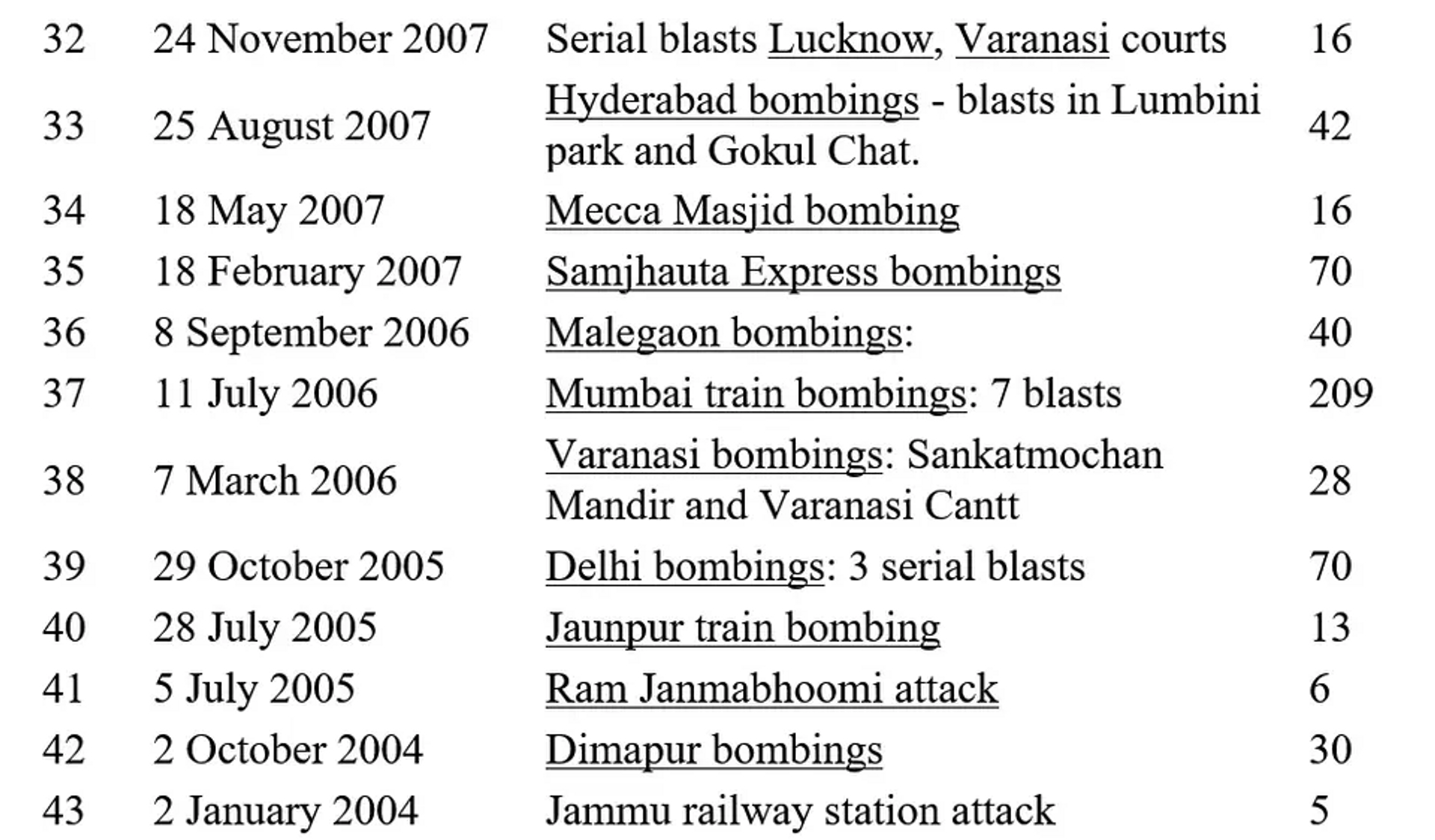 List of Major Terror Attacks in India by Islamists in which >5 people were killed