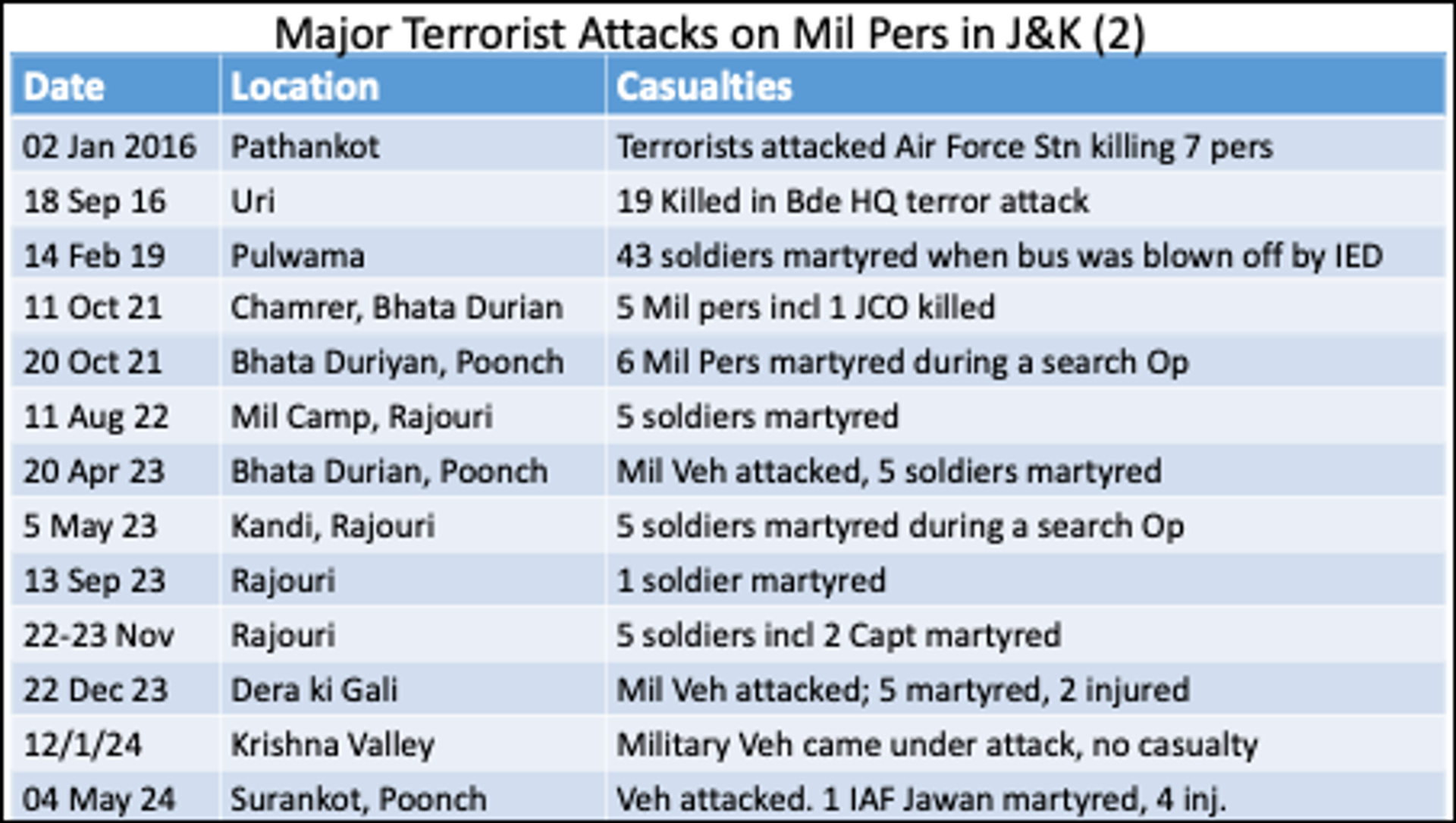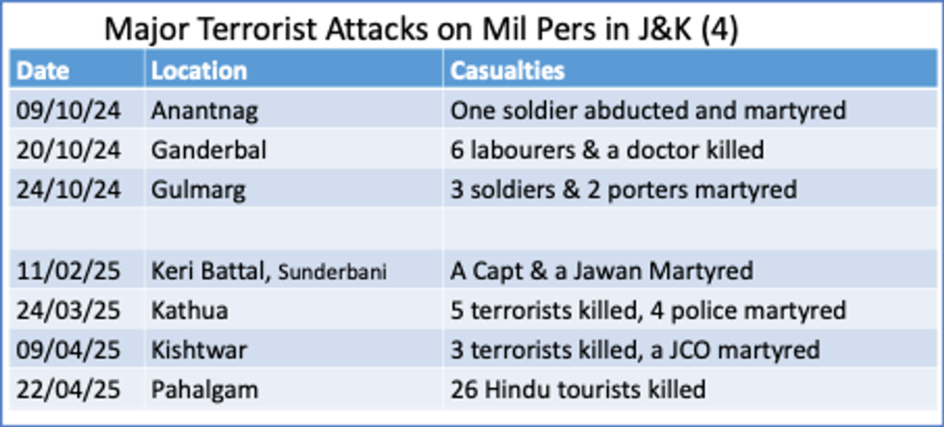 Indian Airspace was violated by Pakistan on 7th May 25 after their network of Jihadi terror active against India was targeted in ‘Op Sindoor’. Op Sindoor was launched by Indian Armed Forces after series of numerous jihadi terrorist attacks coordinated by Pakistan based terror groups, the trigger point being the killing of 26 Hindu tourists in Pahelgam on 22 Apr 25. The resistance Front (TRF) a Pakistan based offshoot of Islamic Terrorists group called Lascar-e-Taiba (LeT) took the responsibility for Pahelgam dastardly attack. The list of major jihadi terror attacks in J&K on civilians & military pers in the recent years are enumerated in the table below. It must be realized that beyond this list, Paki-based jihadi organisations have also indulged in targeted killings of numerous many Kashmiri Hindus in the recent years. Hence, Indian security forces must have been contemplating for a long to attack the Jihadi groups and Pahelgam attack provided the trigger.