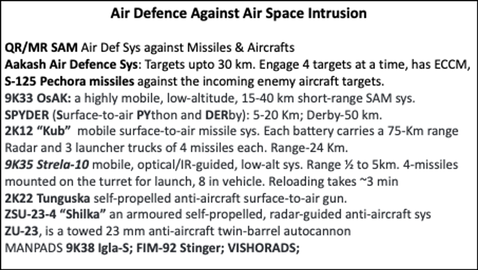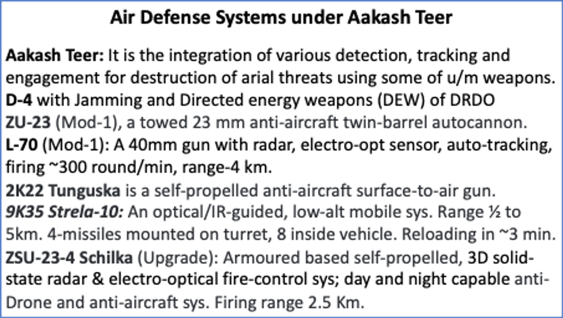 In addition to the above Offensive Air Components, Indian Air force as well as the other two services already have several credible Air Defense systems capable of shooting down enemy aircraft intruding Indian airspace. The enemy aircraft may release their A2S missiles to attack the high value Indian assets or approach the target and try to drop bombs flying close to it. India has several air defense systems that can knock out the approaching enemy aircraft while still distant from the target. These air defense systems are already trusted weapons being used by both IAF and Indian Army. The list of the air defense weapons is mentioned in the text box below: -