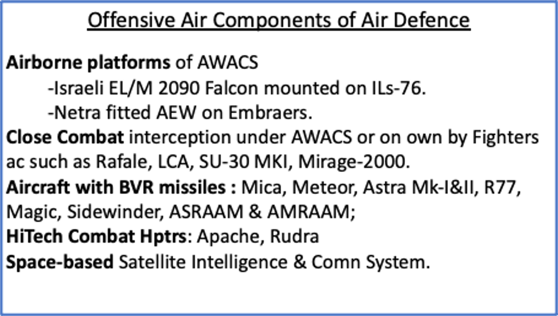 Enemy Aircraft. The next level of Air Defense should be against possible enemy aircraft intrusions with bombs, rockets, A2G or BVR missiles. The aim of deployment should be such that no enemy aircraft ever makes any misadventure of intruding into Indian Air Space. While some of the ground-based Radar detection systems have some limitations in detecting low flying distant objects, Airborne Early Warning Platforms can pick-up enemy aircrafts much withing their own airspace. Once detected, they can be destroyed by an array of own combat aircraft or Air Defense missiles, rockets and guns. Air Defense Missiles include both A2A as well as S2A missiles striking the enemy aircraft both within and Beyond Visual Range (BVR). Indian Air Force also has several combat aircraft that can prevail on enemy aircraft in close combat. Recently inducted Aakash S2A missiles having even ECCM that can beat any enemy aircraft bid to jam them. Once locked on to the enemy arial targets, they are sure to kill. A vast list of Air Defense Systems having vast capabilities to defend the Air force assets and infra are enumerated in the text box below.