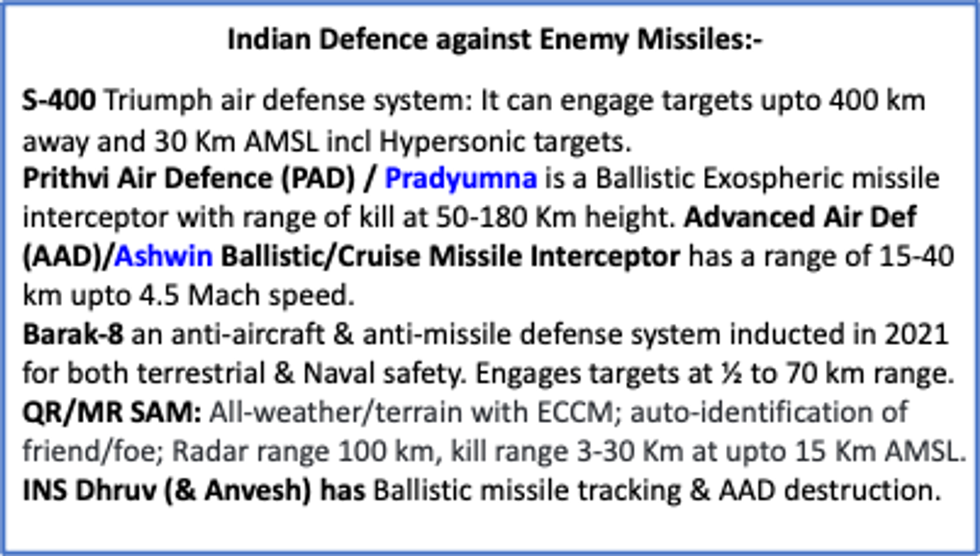 . Missile threats could be of the conventional or nuclear warheads. Any missile approaching over a high value military asset could be assumed as having conventional warheads in all likelihood. It also may have the so-called tactical nuclear warheads that will surely put the target area out of action for ever. India’s present nuclear doctrine is “No first use; and if attacked, Disproportionate Retaliatory strikes”. Nuclear attack of any type will attract retaliation, but the air defense systems must be able to knock out the in-coming missiles in the first place. Any Paki missile with its trajectory to larger cities could be expected to be a strategic nuclear warhead. Hence, it is imperative that all metro cities and major economic hub are kept under anti-missile umbrella of the air defense systems. It could be one or more missile defense system consisting of S 400, Pradyumna, Ashwin, Barak 8, MR/QR SAM or the Aakash as shown in the text box below.