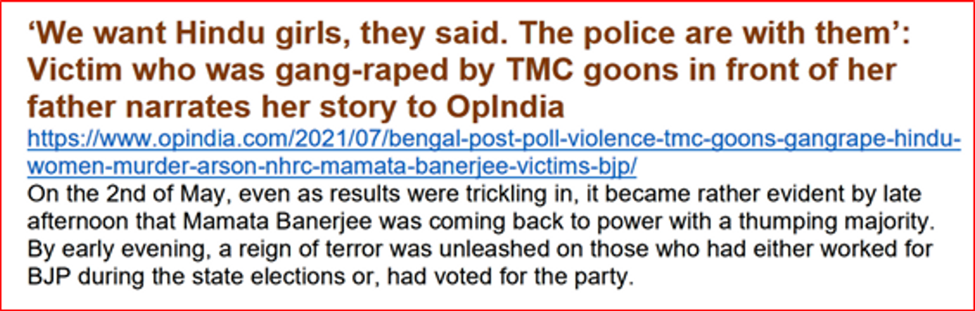 The present response of opposition-ruled state govts are surprising, filled with duplicity be it Bengal, Rajasthan, Jharkhand, Bihar as well as some of the ex-ruing parties in UP (like Congress and Samajwadi parties) and elsewhere where their own actions on 'women dishonouring' were far from satisfactory. Today, Rajasthan is the worst state for Hindu women's safety in the hands of Jihadists to which Rajasthan Congress remains partisan, turning a blind eye. Rajasthan Congress has become an expert in crime against women to the extent that when their own minister raised the issue, he was sacked by CM Ashok Gehlot. Rights of freedom of expression has taken a severe beating in that state. It is a fact that most of the north Indian States of Bengal, Bihar, Jharkhand, UP, Rajasthan have very scant respect for women's rights and honours. Some such instances are enumerated below in the form of clippings of the print media of those times.