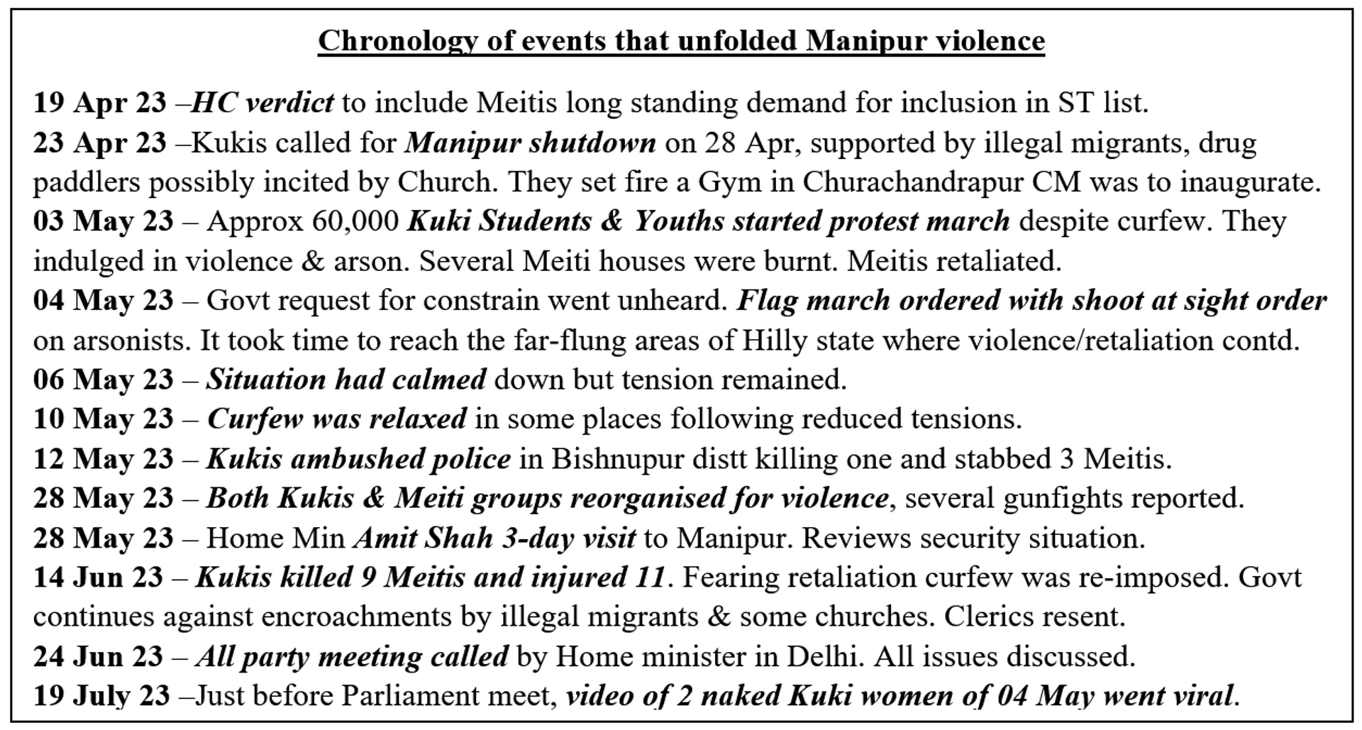 It has to be realised that the present spate of violence was started by Kukis after the High Court verdict to include Meiti tribe in the ST reservation list. The unrest spread like wild fire in several districts with occasional retaliation from Meiti community too. It was a chaos of riots that indulged in loot, arson, violence and deaths. Kukis though in the minority, had automatic rifles and explosives; targeting Meiti people and houses with impunity. It was only when the persecuted community retaliated that they started playing victimhood. Churches, drug-peddlers and illegal Myanmar/ Rohingya/ Bangladeshi migrants sided with Kukis in their nefarious game. This group had been looking for an opportunity to create problems against Manipur govt which has been acting against drug-peddlers and started anti-encroachment drives that infuriated the Churches and illegal migrants. This was just like anti-CAA arson/agitation started by radical Muslims and Muslim-appeasing political groups post-SC verdict on Triple Talaq & Ayodhya, and tha law on Art 370 abrogation that nearly paralysed the nation. In Manipur on 19 Apr 2023 Imphal HC verdict gave that excuse. The chronology of events that unfolded subsequently is given in the text box below.