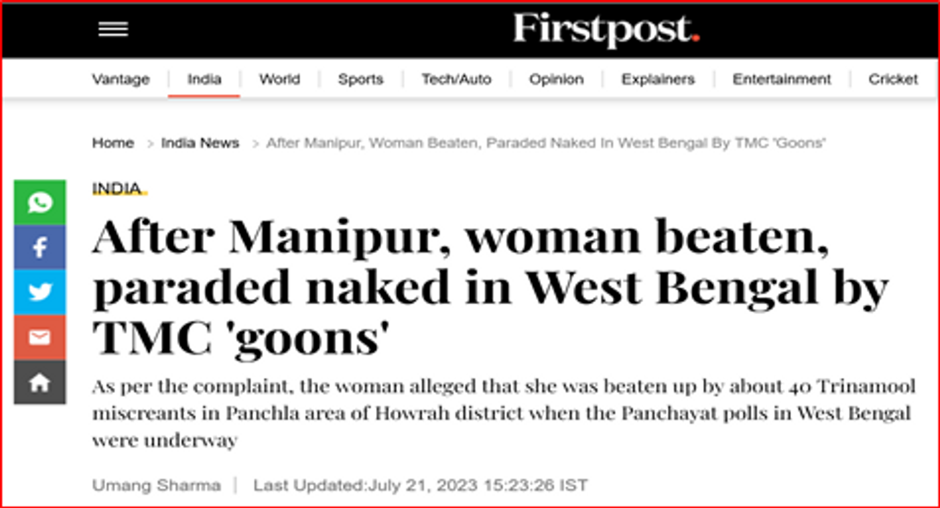 All must know that frenzy violence in Manipur in which the video clip of naked women being chased surfaced, cannot be compared with naked women being chased or paraded elsewhere in the country where law and order prevailed. There are several instances of women dishonoured in a similar way in Bengal, Bihar, Jharkhand, Rajasthan or elsewhere. In the relatively calm atmosphere of law and order, if such incidents took place, it is a heinous crime and failure of govt. It is another matter though that the same politicians were mum and insensitive when women in their respective states were/are being dishonoured under their jurisdictions. Shamefully Mamata Banerjee chooses to remain mum to the incident of women of the other party workers were paraded naked by her own TMC goons. Post-election violence of 2021 in Bengal is still fresh in our minds when several women of BJP workers were paraded naked and raped by TMC goons. Recently women were dragged naked in Bengal during Panchayat elections. However, Mamata remains silent both in words and actions against her goons. It is another matter though that BJP leadership also remains docile and didn’t treat Mamata or her party workers the same way during/after elections in Goa or Tripura (read “Intolerance against BJP workers: Weakness of JP Nadda?”).