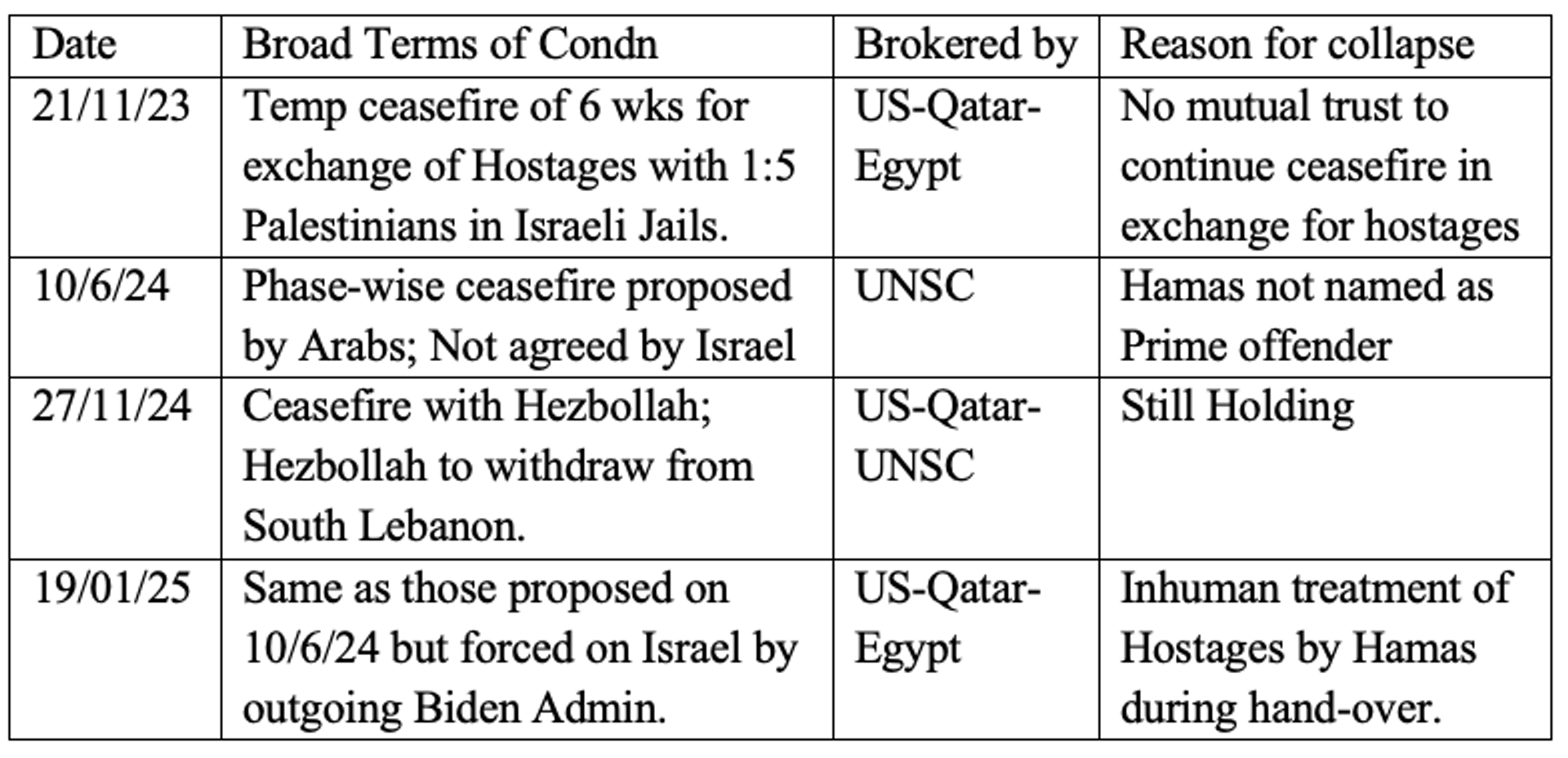 In the >18 months of Israeli military offensive against Hamas 7th Oct 2023 genocidal attack on Israel, the 2nd ceasefire was brokered on 19 Jan 25 which has ended, leading to the IDF attacks being resumed. Various ceasefire bids are enumerated in the text box below:-