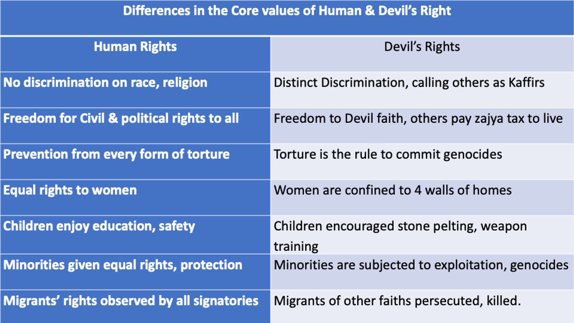 There are some groups/faiths/beliefs that promote hatred and intolerance towards the believers of other faiths/religions leading to numerous indulgences, atrocities, violence and terrorism (read “Major Jihadi attacks in world”, https://thecounterviews.in/articles/major-islamic-jihadi-attacks-in-the-world/). This is where many of the revered bodies of the UN and international institutions are held culpable by remaining mum to the ongoing persecutions and genocides (read “Muted UN/UNSC response encouraging genocides”, https://thecounterviews.in/articles/muted-unhrc-response-encouraging-islamic-genocide/). These acts of violence, persecution & terrorism are indicative of “Devil’s Rights” which deny human rights of equality and civil rights incl religious freedom.